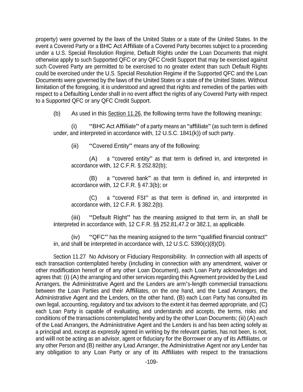 -109- property) were governed by the laws of the United States or a state of the United States. In the event a Covered Party or a BHC Act Affiliate of a Covered Party becomes subject to a proceeding under a U.S. Special Resolution Regime, Default Rights under the Loan Documents that might otherwise apply to such Supported QFC or any QFC Credit Support that may be exercised against such Covered Party are permitted to be exercised to no greater extent than such Default Rights could be exercised under the U.S. Special Resolution Regime if the Supported QFC and the Loan Documents were governed by the laws of the United States or a state of the United States. Without limitation of the foregoing, it is understood and agreed that rights and remedies of the parties with respect to a Defaulting Lender shall in no event affect the rights of any Covered Party with respect to a Supported QFC or any QFC Credit Support. (b) As used in this Section 11.26, the following terms have the following meanings: (i) “BHC Act Affiliate” of a party means an “affiliate” (as such term is defined under, and interpreted in accordance with, 12 U.S.C. 1841(k)) of such party. (ii) “Covered Entity” means any of the following: (A) a “covered entity” as that term is defined in, and interpreted in accordance with, 12 C.F.R. § 252.82(b); (B) a “covered bank” as that term is defined in, and interpreted in accordance with, 12 C.F.R. § 47.3(b); or (C) a “covered FSI” as that term is defined in, and interpreted in accordance with, 12 C.F.R. § 382.2(b). (iii) “Default Right” has the meaning assigned to that term in, an shall be interpreted in accordance with, 12 C.F.R. §§ 252.81,47.2 or 382.1, as applicable. (iv) “QFC” has the meaning assigned to the term “qualified financial contract” in, and shall be interpreted in accordance with, 12 U.S.C. 5390(c)(8)(D). Section 11.27 No Advisory or Fiduciary Responsibility. In connection with all aspects of each transaction contemplated hereby (including in connection with any amendment, waiver or other modification hereof or of any other Loan Document), each Loan Party acknowledges and agrees that: (i) (A) the arranging and other services regarding this Agreement provided by the Lead Arrangers, the Administrative Agent and the Lenders are arm’s-length commercial transactions between the Loan Parties and their Affiliates, on the one hand, and the Lead Arrangers, the Administrative Agent and the Lenders, on the other hand, (B) each Loan Party has consulted its own legal, accounting, regulatory and tax advisors to the extent it has deemed appropriate, and (C) each Loan Party is capable of evaluating, and understands and accepts, the terms, risks and conditions of the transactions contemplated hereby and by the other Loan Documents; (ii) (A) each of the Lead Arrangers, the Administrative Agent and the Lenders is and has been acting solely as a principal and, except as expressly agreed in writing by the relevant parties, has not been, is not, and will not be acting as an advisor, agent or fiduciary for the Borrower or any of its Affiliates, or any other Person and (B) neither any Lead Arranger, the Administrative Agent nor any Lender has any obligation to any Loan Party or any of its Affiliates with respect to the transactions