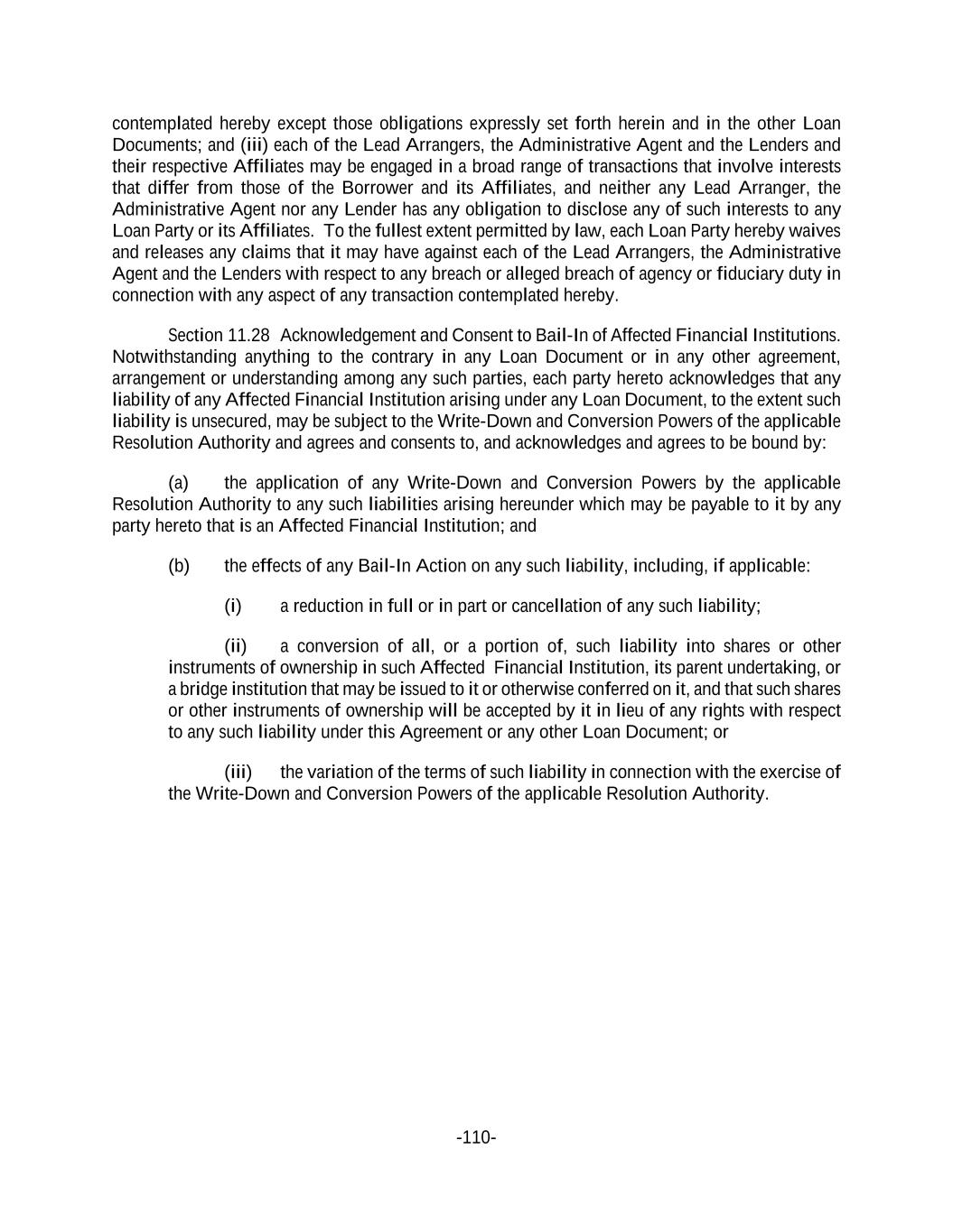-110- contemplated hereby except those obligations expressly set forth herein and in the other Loan Documents; and (iii) each of the Lead Arrangers, the Administrative Agent and the Lenders and their respective Affiliates may be engaged in a broad range of transactions that involve interests that differ from those of the Borrower and its Affiliates, and neither any Lead Arranger, the Administrative Agent nor any Lender has any obligation to disclose any of such interests to any Loan Party or its Affiliates. To the fullest extent permitted by law, each Loan Party hereby waives and releases any claims that it may have against each of the Lead Arrangers, the Administrative Agent and the Lenders with respect to any breach or alleged breach of agency or fiduciary duty in connection with any aspect of any transaction contemplated hereby. Section 11.28 Acknowledgement and Consent to Bail-In of Affected Financial Institutions. Notwithstanding anything to the contrary in any Loan Document or in any other agreement, arrangement or understanding among any such parties, each party hereto acknowledges that any liability of any Affected Financial Institution arising under any Loan Document, to the extent such liability is unsecured, may be subject to the Write-Down and Conversion Powers of the applicable Resolution Authority and agrees and consents to, and acknowledges and agrees to be bound by: (a) the application of any Write-Down and Conversion Powers by the applicable Resolution Authority to any such liabilities arising hereunder which may be payable to it by any party hereto that is an Affected Financial Institution; and (b) the effects of any Bail-In Action on any such liability, including, if applicable: (i) a reduction in full or in part or cancellation of any such liability; (ii) a conversion of all, or a portion of, such liability into shares or other instruments of ownership in such Affected Financial Institution, its parent undertaking, or a bridge institution that may be issued to it or otherwise conferred on it, and that such shares or other instruments of ownership will be accepted by it in lieu of any rights with respect to any such liability under this Agreement or any other Loan Document; or (iii) the variation of the terms of such liability in connection with the exercise of the Write-Down and Conversion Powers of the applicable Resolution Authority.
