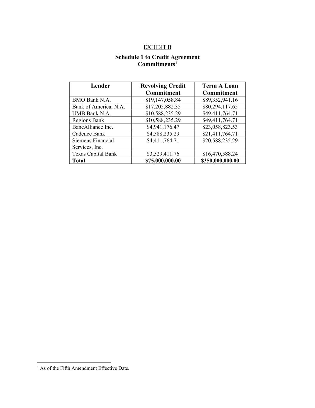 EXHIBIT B Schedule 1 to Credit Agreement Commitments1 Lender Revolving Credit Commitment Term A Loan Commitment BMO Bank N.A. $19,147,058.84 $89,352,941.16 Bank of America, N.A. $17,205,882.35 $80,294,117.65 UMB Bank N.A. $10,588,235.29 $49,411,764.71 Regions Bank $10,588,235.29 $49,411,764.71 BancAlliance Inc. $4,941,176.47 $23,058,823.53 Cadence Bank $4,588,235.29 $21,411,764.71 Siemens Financial Services, Inc. $4,411,764.71 $20,588,235.29 Texas Capital Bank $3,529,411.76 $16,470,588.24 Total $75,000,000.00 $350,000,000.00 1 As of the Fifth Amendment Effective Date.