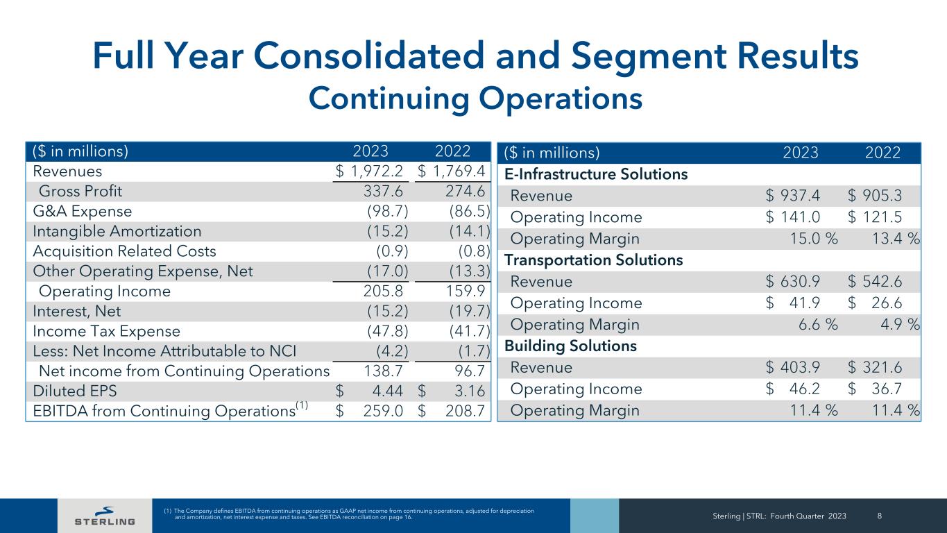 Sterling | STRL: Fourth Quarter 2023 7 Quarterly Consolidated and Segment Results Continuing Operations ($ in millions) Q4 2023 Q4 2022 Revenues $ 486.0 $ 448.6 Gross Profit 91.8 69.0 G&A Expense (26.1) (23.1) Intangible Amortization (4.0) (3.5) Acquisition Related Costs (0.5) (0.3) Other Operating Expense, Net (5.3) (5.0) Operating Income 55.8 37.0 Interest, Net (1.0) (5.6) Income Tax Expense (12.3) (10.7) Less: Net Income Attributable to NCI (2.3) (0.4) Net income from Continuing Operations $ 40.2 $ 20.2 Diluted EPS $ 1.28 $ 0.66 EBITDA from Continuing Operations(1) $ 68.4 $ 49.9 ($ in millions) Q4 2023 Q4 2022 E-Infrastructure Solutions Revenue $ 217.5 $ 247.3 Operating Income $ 37.6 $ 29.8 Operating Margin 17.3 % 12.1 % Transportation Solutions Revenue $ 175.7 $ 126.5 Operating Income $ 12.3 $ 5.1 Operating Margin 7.0 % 4.0 % Building Solutions Revenue $ 92.8 $ 74.8 Operating Income $ 11.2 $ 8.3 Operating Margin 12.0 % 11.0 % (1) The Company defines EBITDA from continuing operations as GAAP net income from continuing operations, adjusted for depreciation and amortization, net interest expense and taxes. See EBITDA reconciliation on page 16.