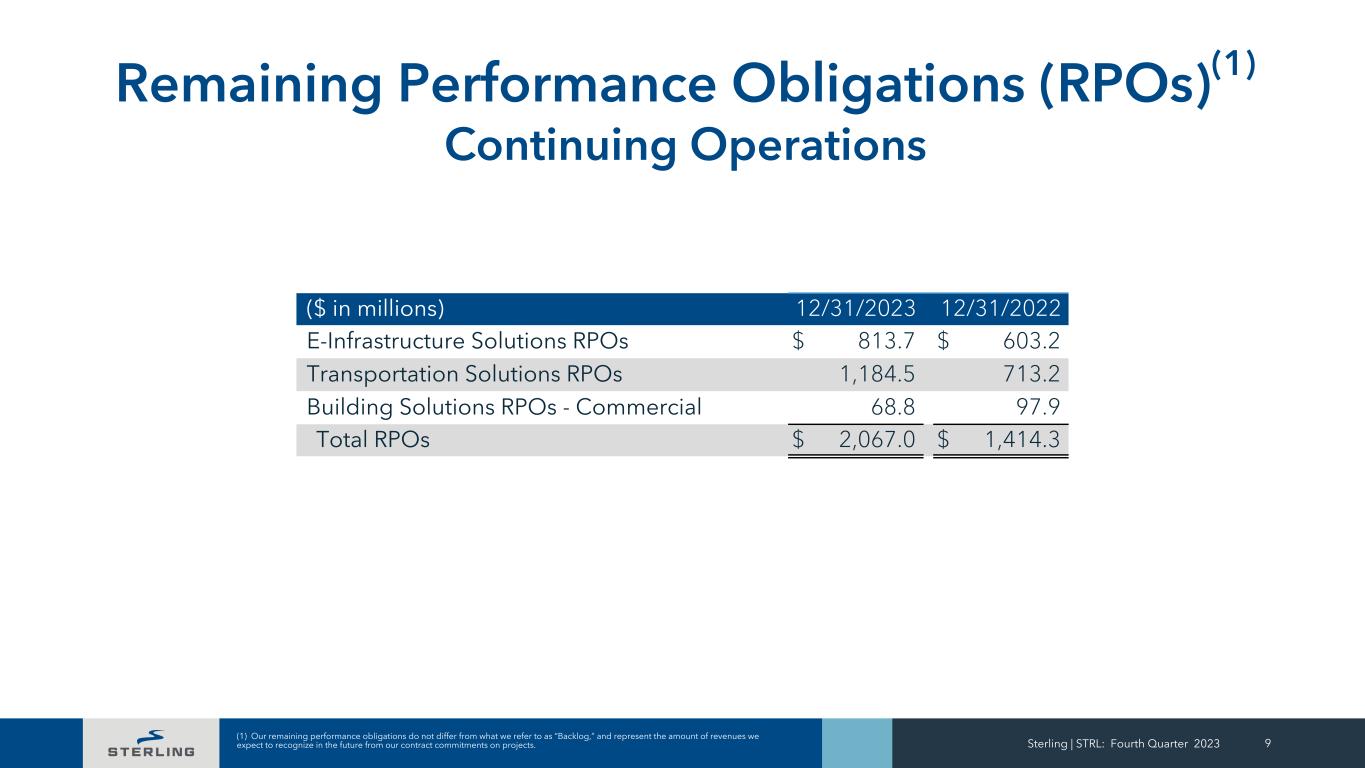 Sterling | STRL: Fourth Quarter 2023 8 Full Year Consolidated and Segment Results Continuing Operations ($ in millions) 2023 2022 Revenues $ 1,972.2 $ 1,769.4 Gross Profit 337.6 274.6 G&A Expense (98.7) (86.5) Intangible Amortization (15.2) (14.1) Acquisition Related Costs (0.9) (0.8) Other Operating Expense, Net (17.0) (13.3) Operating Income 205.8 159.9 Interest, Net (15.2) (19.7) Income Tax Expense (47.8) (41.7) Less: Net Income Attributable to NCI (4.2) (1.7) Net income from Continuing Operations 138.7 96.7 Diluted EPS $ 4.44 $ 3.16 EBITDA from Continuing Operations(1) $ 259.0 $ 208.7 ($ in millions) 2023 2022 E-Infrastructure Solutions Revenue $ 937.4 $ 905.3 Operating Income $ 141.0 $ 121.5 Operating Margin 15.0 % 13.4 % Transportation Solutions Revenue $ 630.9 $ 542.6 Operating Income $ 41.9 $ 26.6 Operating Margin 6.6 % 4.9 % Building Solutions Revenue $ 403.9 $ 321.6 Operating Income $ 46.2 $ 36.7 Operating Margin 11.4 % 11.4 % (1) The Company defines EBITDA from continuing operations as GAAP net income from continuing operations, adjusted for depreciation and amortization, net interest expense and taxes. See EBITDA reconciliation on page 16.