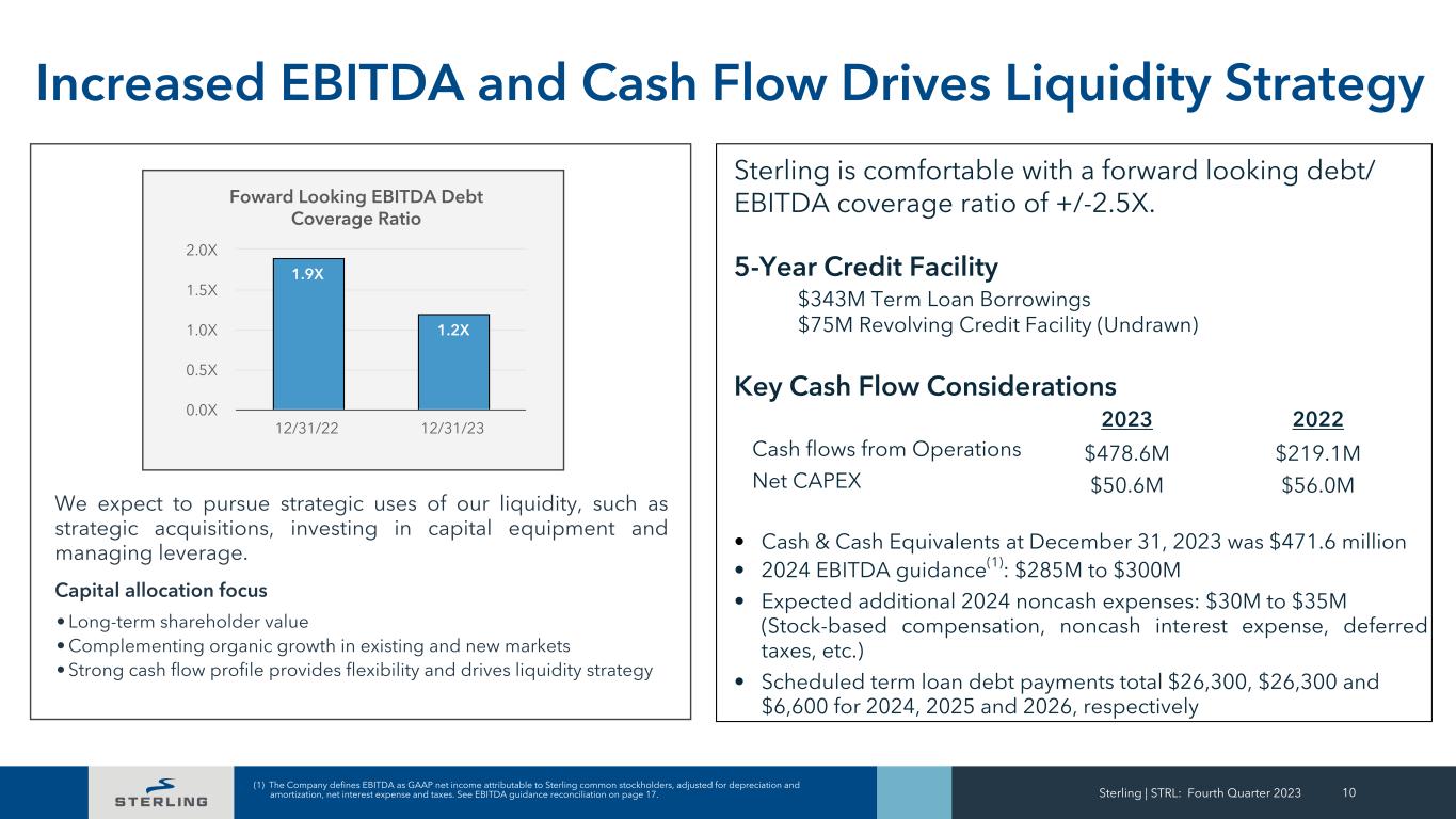 Sterling | STRL: Fourth Quarter 2023 9 Remaining Performance Obligations (RPOs)(1) Continuing Operations ($ in millions) 12/31/2023 12/31/2022 E-Infrastructure Solutions RPOs $ 813.7 $ 603.2 Transportation Solutions RPOs 1,184.5 713.2 Building Solutions RPOs - Commercial 68.8 97.9 Total RPOs $ 2,067.0 $ 1,414.3 (1) Our remaining performance obligations do not differ from what we refer to as “Backlog,” and represent the amount of revenues we expect to recognize in the future from our contract commitments on projects.