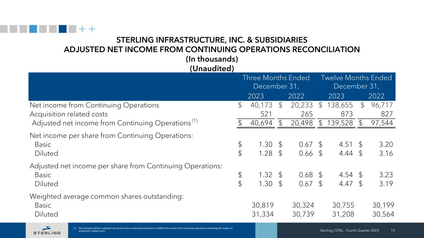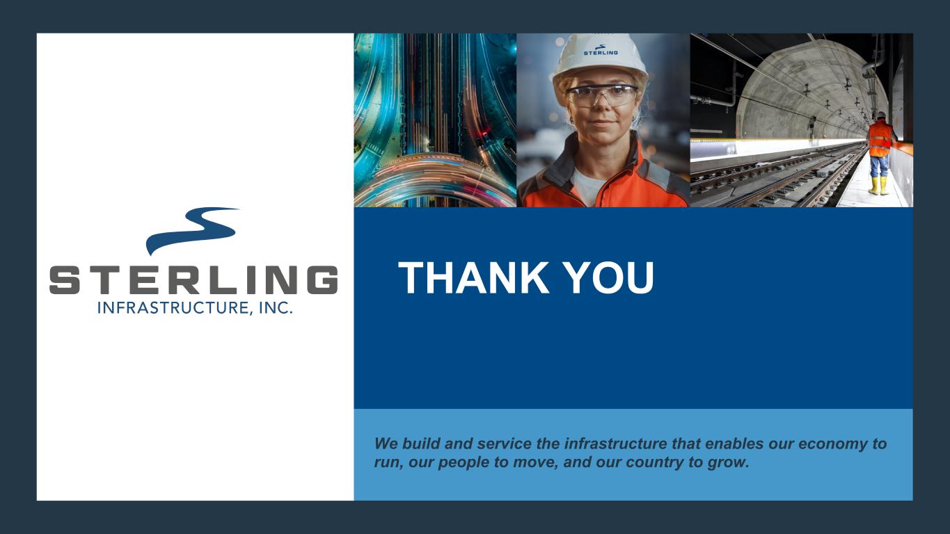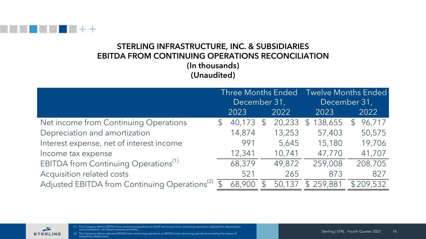 Sterling | STRL: Fourth Quarter 2023 15 (1) The Company defines adjusted net income from continuing operations as GAAP net income from continuing operations excluding the impact of acquisition related costs. Three Months Ended December 31, Twelve Months Ended December 31, 2023 2022 2023 2022 Net income from Continuing Operations $ 40,173 $ 20,233 $ 138,655 $ 96,717 Acquisition related costs 521 265 873 827 Adjusted net income from Continuing Operations (1) $ 40,694 $ 20,498 $ 139,528 $ 97,544 Net income per share from Continuing Operations: Basic $ 1.30 $ 0.67 $ 4.51 $ 3.20 Diluted $ 1.28 $ 0.66 $ 4.44 $ 3.16 Adjusted net income per share from Continuing Operations: Basic $ 1.32 $ 0.68 $ 4.54 $ 3.23 Diluted $ 1.30 $ 0.67 $ 4.47 $ 3.19 Weighted average common shares outstanding: Basic 30,819 30,324 30,755 30,199 Diluted 31,334 30,739 31,208 30,564 STERLING INFRASTRUCTURE, INC. & SUBSIDIARIES ADJUSTED NET INCOME FROM CONTINUING OPERATIONS RECONCILIATION (In thousands) (Unaudited)