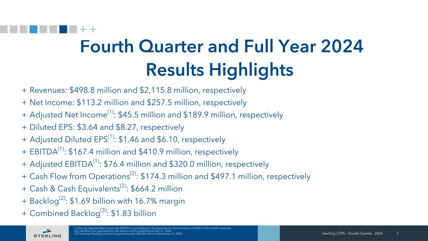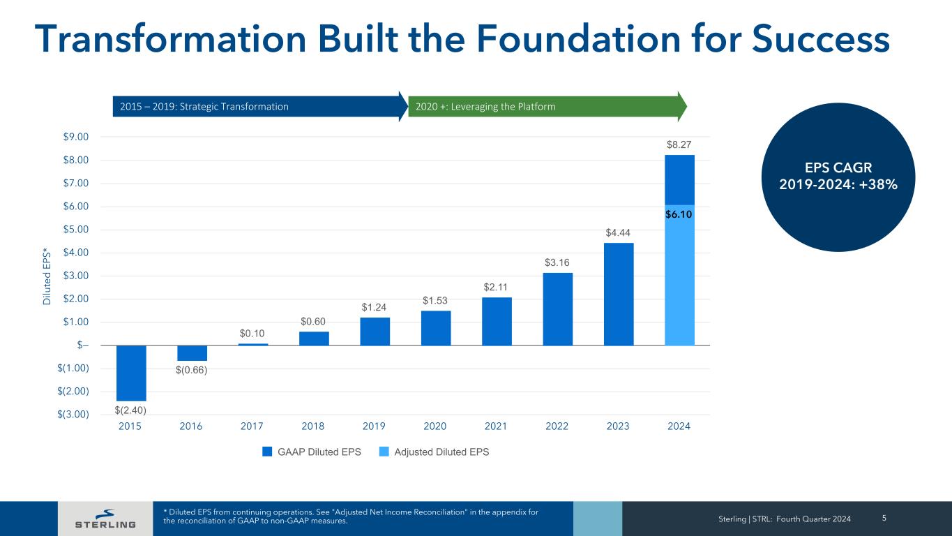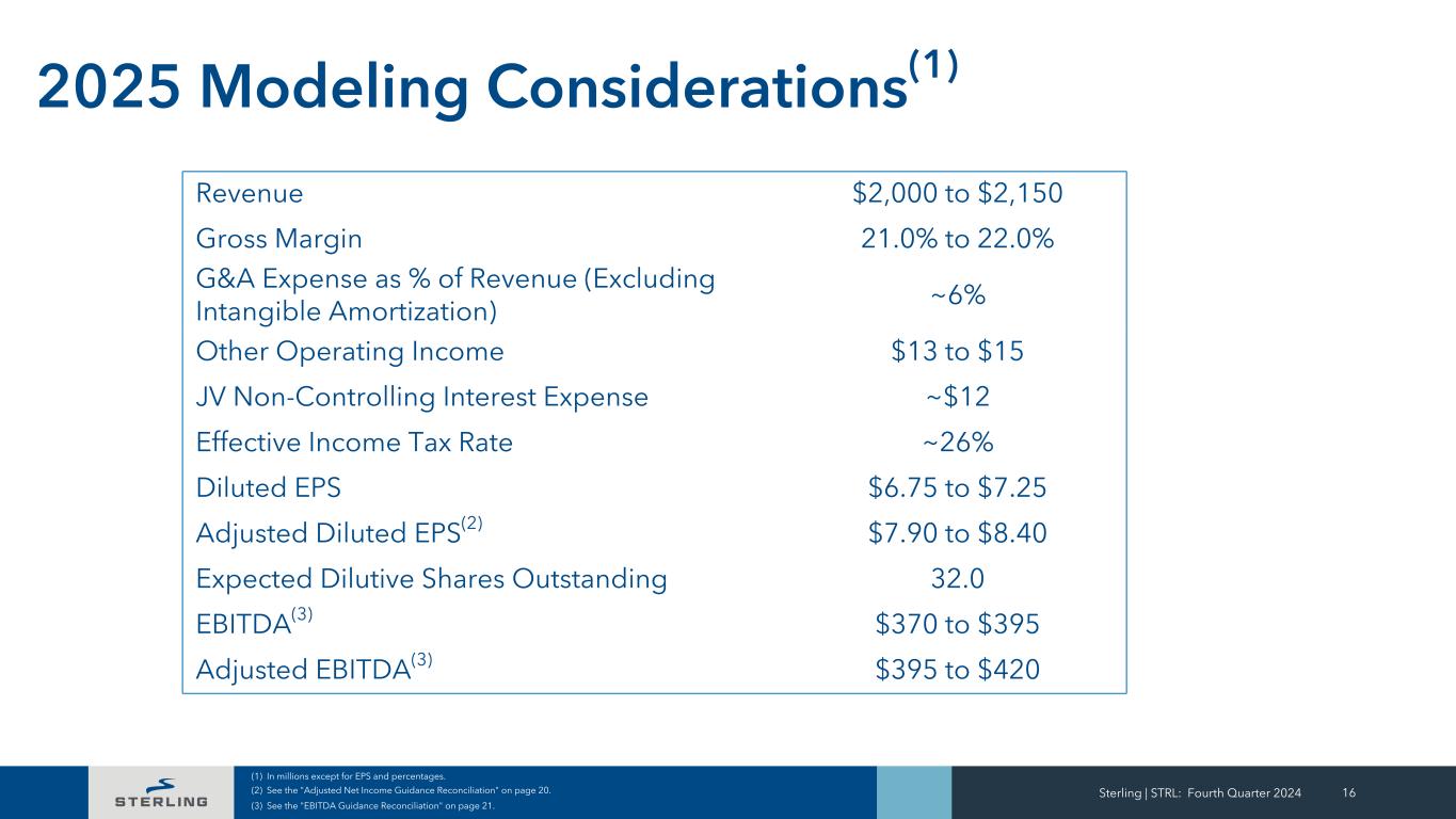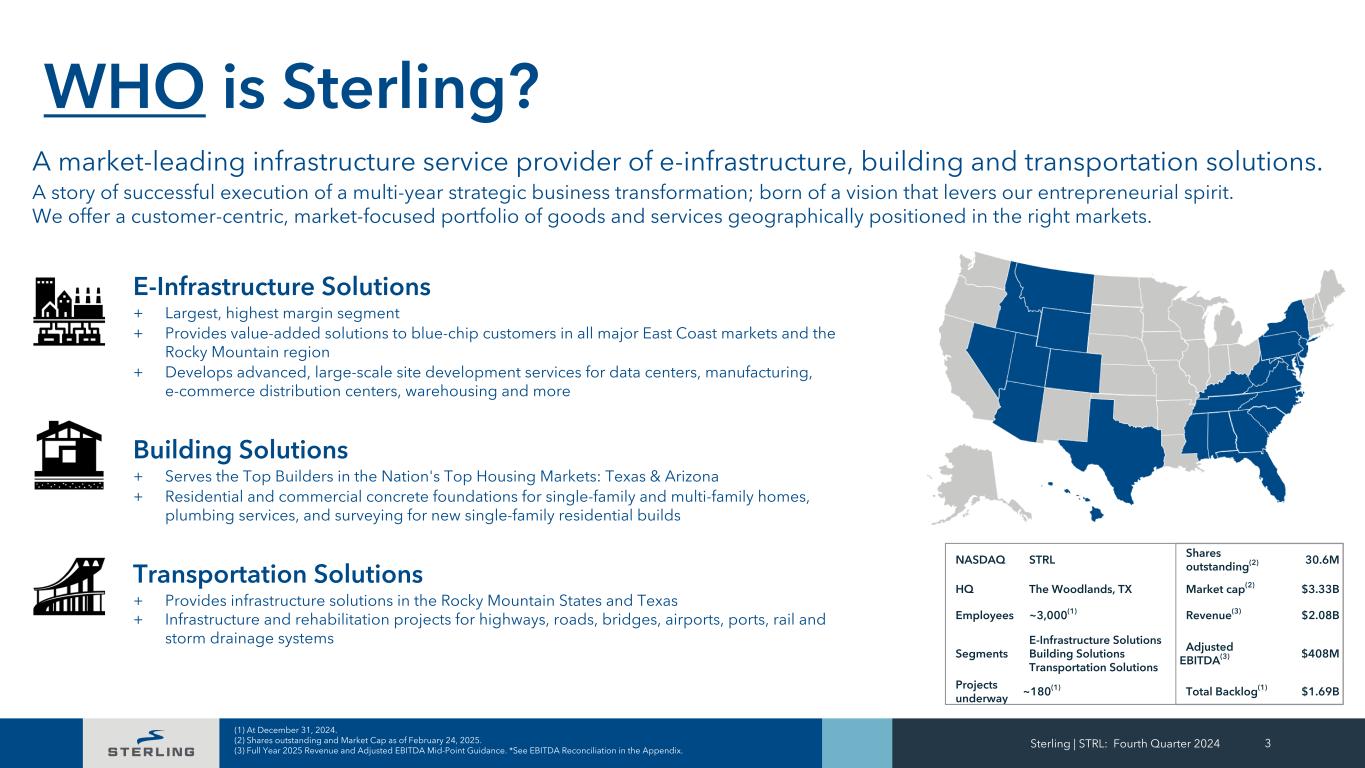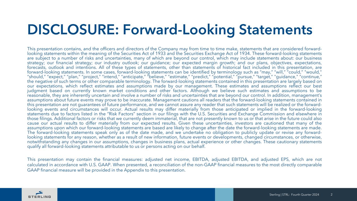 2Sterling | STRL: Fourth Quarter 2024 DISCLOSURE: Forward-Looking Statements This presentation contains, and the officers and directors of the Company may from time to time make, statements that are considered forward- looking statements within the meaning of the Securities Act of 1933 and the Securities Exchange Act of 1934. These forward-looking statements are subject to a number of risks and uncertainties, many of which are beyond our control, which may include statements about: our business strategy; our financial strategy; our industry outlook; our guidance; our expected margin growth; and our plans, objectives, expectations, forecasts, outlook and intentions. All of these types of statements, other than statements of historical fact included in this presentation, are forward-looking statements. In some cases, forward-looking statements can be identified by terminology such as “may,” “will,” “could,” "would," “should,” “expect,” “plan,” “project,” “intend,” “anticipate,” “believe,” “estimate,” “predict,” “potential,” “pursue,” “target,” "guidance," “continue,” the negative of such terms or other comparable terminology. The forward-looking statements contained in this presentation are largely based on our expectations, which reflect estimates and assumptions made by our management. These estimates and assumptions reflect our best judgment based on currently known market conditions and other factors. Although we believe such estimates and assumptions to be reasonable, they are inherently uncertain and involve a number of risks and uncertainties that are beyond our control. In addition, management’s assumptions about future events may prove to be inaccurate. Management cautions all readers that the forward-looking statements contained in this presentation are not guarantees of future performance, and we cannot assure any reader that such statements will be realized or the forward- looking events and circumstances will occur. Actual results may differ materially from those anticipated or implied in the forward-looking statements due to factors listed in the “Risk Factors” section in our filings with the U.S. Securities and Exchange Commission and elsewhere in those filings. Additional factors or risks that we currently deem immaterial, that are not presently known to us or that arise in the future could also cause our actual results to differ materially from our expected results. Given these uncertainties, investors are cautioned that many of the assumptions upon which our forward-looking statements are based are likely to change after the date the forward-looking statements are made. The forward-looking statements speak only as of the date made, and we undertake no obligation to publicly update or revise any forward- looking statements for any reason, whether as a result of new information, future events or developments, changed circumstances, or otherwise, notwithstanding any changes in our assumptions, changes in business plans, actual experience or other changes. These cautionary statements qualify all forward-looking statements attributable to us or persons acting on our behalf. This presentation may contain the financial measures: adjusted net income, EBITDA, adjusted EBITDA, and adjusted EPS, which are not calculated in accordance with U.S. GAAP. When presented, a reconciliation of the non-GAAP financial measures to the most directly comparable GAAP financial measure will be provided in the Appendix to this presentation.