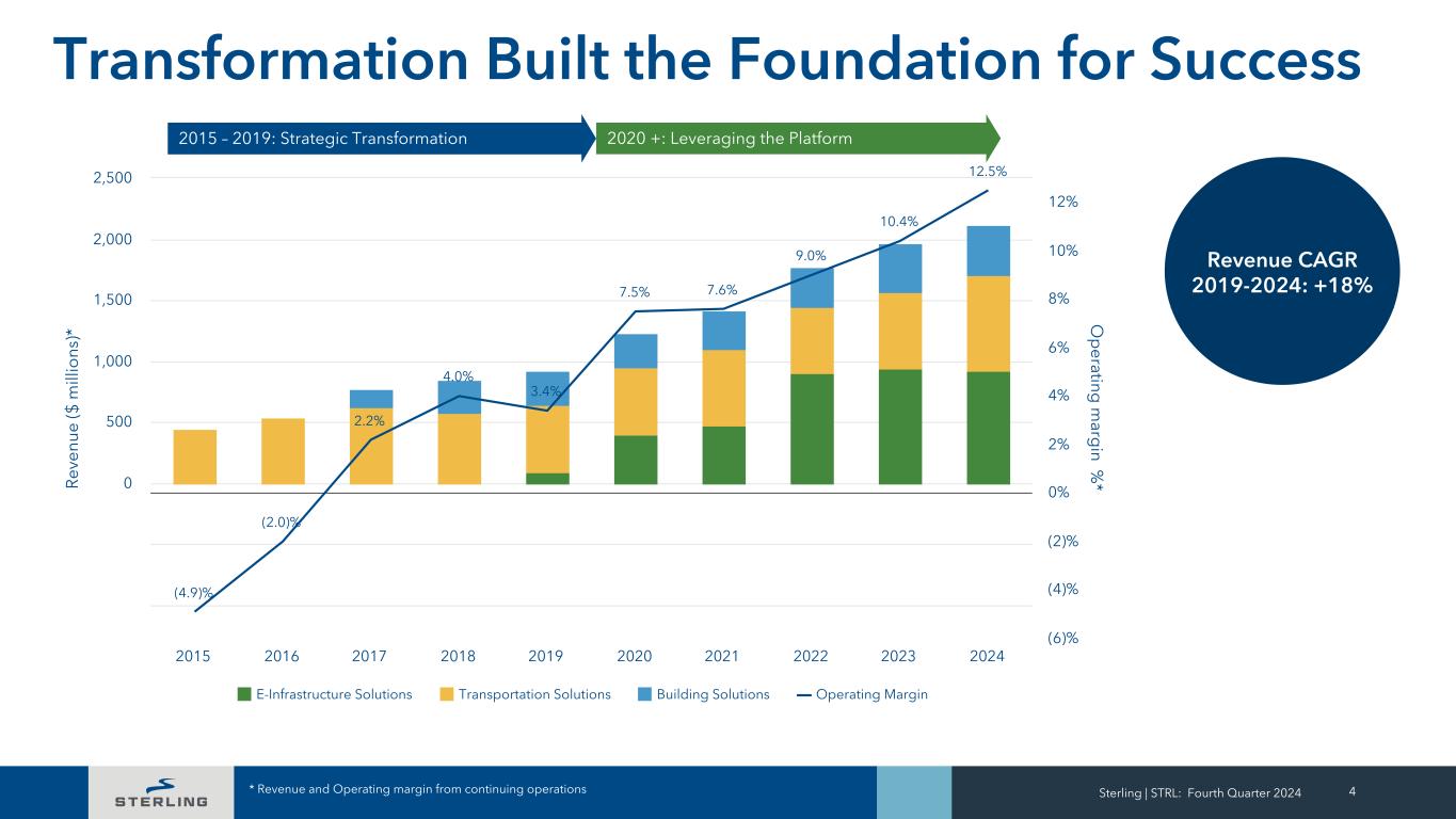 E-Infrastructure Solutions + Largest, highest margin segment + Provides value-added solutions to blue-chip customers in all major East Coast markets and the Rocky Mountain region + Develops advanced, large-scale site development services for data centers, manufacturing, e-commerce distribution centers, warehousing and more Building Solutions + Serves the Top Builders in the Nation's Top Housing Markets: Texas & Arizona + Residential and commercial concrete foundations for single-family and multi-family homes, plumbing services, and surveying for new single-family residential builds Transportation Solutions + Provides infrastructure solutions in the Rocky Mountain States and Texas + Infrastructure and rehabilitation projects for highways, roads, bridges, airports, ports, rail and storm drainage systems Sterling | STRL: Fourth Quarter 2024 3 WHO is Sterling? NASDAQ STRL Shares outstanding(2) 30.6M HQ The Woodlands, TX Market cap(2) $3.33B Employees ~3,000(1) Revenue(3) $2.08B Segments E-Infrastructure Solutions Building Solutions Transportation Solutions Adjusted EBITDA(3) $408M Projects underway ~180(1) Total Backlog(1) $1.69B A market-leading infrastructure service provider of e-infrastructure, building and transportation solutions. A story of successful execution of a multi-year strategic business transformation; born of a vision that levers our entrepreneurial spirit. We offer a customer-centric, market-focused portfolio of goods and services geographically positioned in the right markets. (1) At December 31, 2024. (2) Shares outstanding and Market Cap as of February 24, 2025. (3) Full Year 2025 Revenue and Adjusted EBITDA Mid-Point Guidance. *See EBITDA Reconciliation in the Appendix.