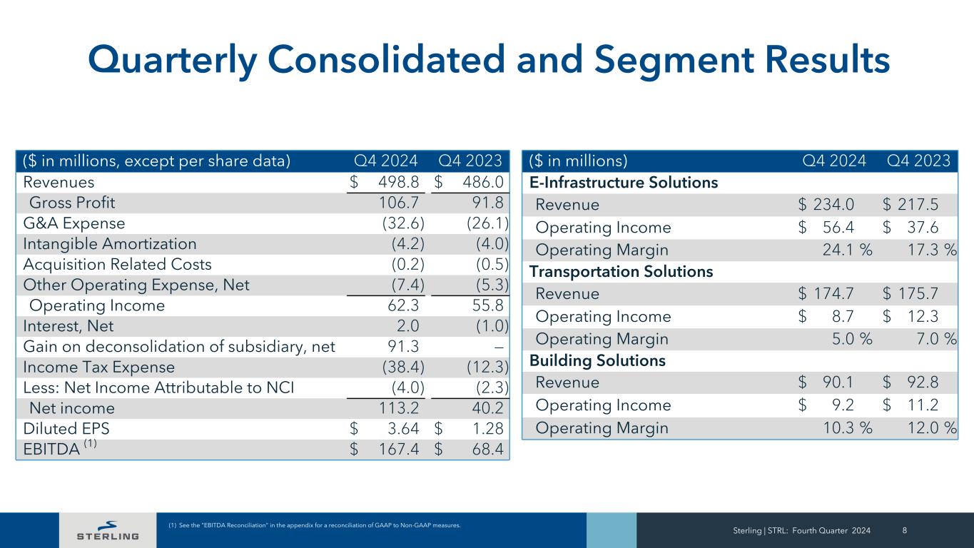 Fourth Quarter and Full Year 2024 Results Highlights + Revenues: $498.8 million and $2,115.8 million, respectively + Net Income: $113.2 million and $257.5 million, respectively + Adjusted Net Income(1): $45.5 million and $189.9 million, respectively + Diluted EPS: $3.64 and $8.27, respectively + Adjusted Diluted EPS(1): $1.46 and $6.10, respectively + EBITDA(1): $167.4 million and $410.9 million, respectively + Adjusted EBITDA(1): $76.4 million and $320.0 million, respectively + Cash Flow from Operations(2): $174.3 million and $497.1 million, respectively + Cash & Cash Equivalents(2): $664.2 million + Backlog(2): $1.69 billion with 16.7% margin + Combined Backlog(3): $1.83 billion Sterling | STRL: Fourth Quarter 2024 7 (1) See the Adjusted Net Income and EBITDA reconciliations in the appendix for reconciliations of GAAP to Non-GAAP measures. (2) Cash flow from operations for the twelve months ended December 31, 2024. (3) Combined Backlog includes Unsigned Awards of $138 million at December 31, 2024.