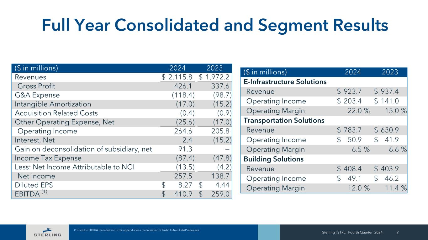 Sterling | STRL: Fourth Quarter 2024 8 Quarterly Consolidated and Segment Results ($ in millions, except per share data) Q4 2024 Q4 2023 Revenues $ 498.8 $ 486.0 Gross Profit 106.7 91.8 G&A Expense (32.6) (26.1) Intangible Amortization (4.2) (4.0) Acquisition Related Costs (0.2) (0.5) Other Operating Expense, Net (7.4) (5.3) Operating Income 62.3 55.8 Interest, Net 2.0 (1.0) Gain on deconsolidation of subsidiary, net 91.3 — Income Tax Expense (38.4) (12.3) Less: Net Income Attributable to NCI (4.0) (2.3) Net income 113.2 40.2 Diluted EPS $ 3.64 $ 1.28 EBITDA (1) $ 167.4 $ 68.4 ($ in millions) Q4 2024 Q4 2023 E-Infrastructure Solutions Revenue $ 234.0 $ 217.5 Operating Income $ 56.4 $ 37.6 Operating Margin 24.1 % 17.3 % Transportation Solutions Revenue $ 174.7 $ 175.7 Operating Income $ 8.7 $ 12.3 Operating Margin 5.0 % 7.0 % Building Solutions Revenue $ 90.1 $ 92.8 Operating Income $ 9.2 $ 11.2 Operating Margin 10.3 % 12.0 % (1) See the "EBITDA Reconciliation" in the appendix for a reconciliation of GAAP to Non-GAAP measures.