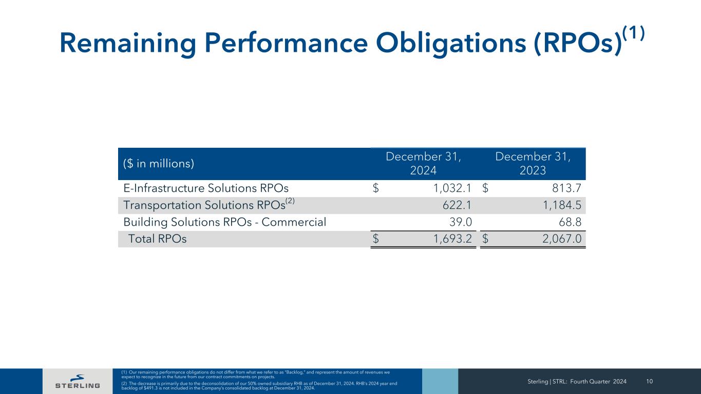 Sterling | STRL: Fourth Quarter 2024 9 Full Year Consolidated and Segment Results ($ in millions) 2024 2023 Revenues $ 2,115.8 $ 1,972.2 Gross Profit 426.1 337.6 G&A Expense (118.4) (98.7) Intangible Amortization (17.0) (15.2) Acquisition Related Costs (0.4) (0.9) Other Operating Expense, Net (25.6) (17.0) Operating Income 264.6 205.8 Interest, Net 2.4 (15.2) Gain on deconsolidation of subsidiary, net 91.3 — Income Tax Expense (87.4) (47.8) Less: Net Income Attributable to NCI (13.5) (4.2) Net income 257.5 138.7 Diluted EPS $ 8.27 $ 4.44 EBITDA (1) $ 410.9 $ 259.0 ($ in millions) 2024 2023 E-Infrastructure Solutions Revenue $ 923.7 $ 937.4 Operating Income $ 203.4 $ 141.0 Operating Margin 22.0 % 15.0 % Transportation Solutions Revenue $ 783.7 $ 630.9 Operating Income $ 50.9 $ 41.9 Operating Margin 6.5 % 6.6 % Building Solutions Revenue $ 408.4 $ 403.9 Operating Income $ 49.1 $ 46.2 Operating Margin 12.0 % 11.4 % (1) See the EBITDA reconciliation in the appendix for a reconciliation of GAAP to Non-GAAP measures.