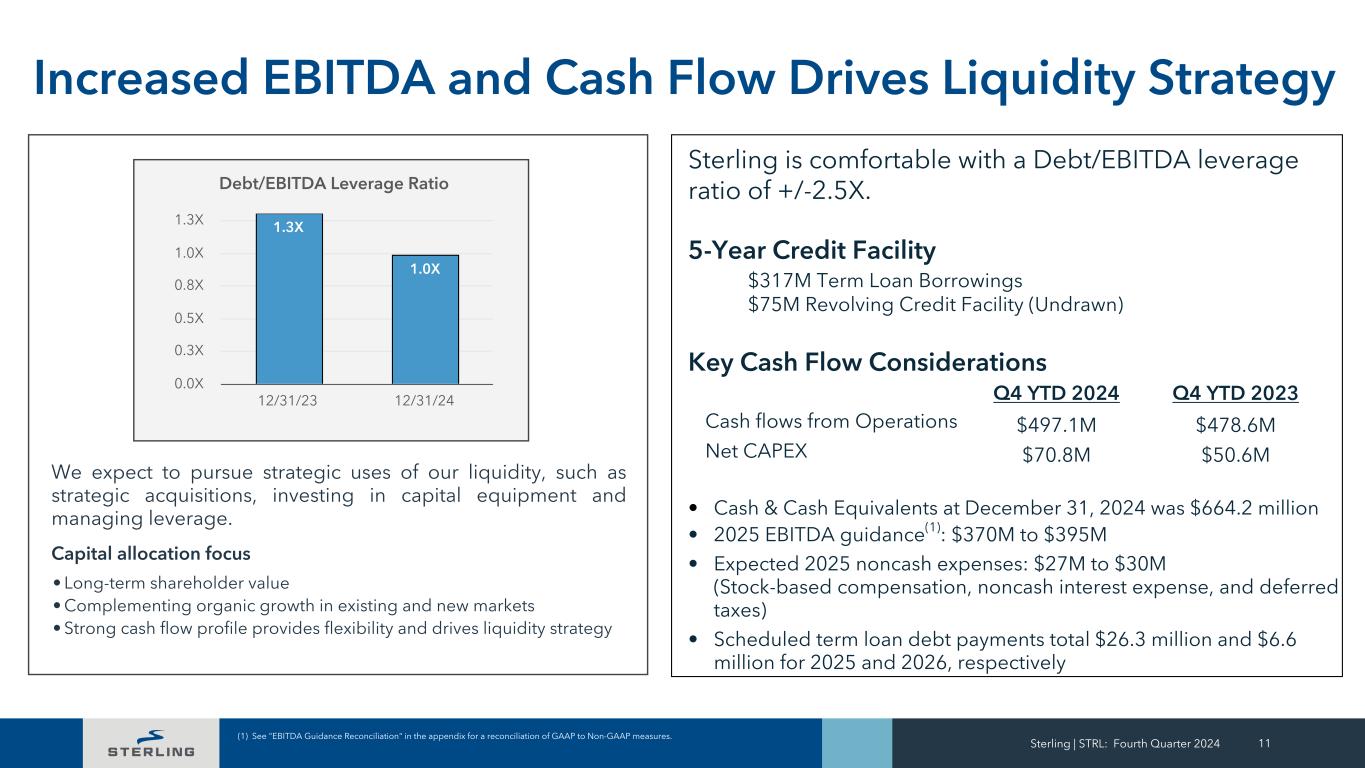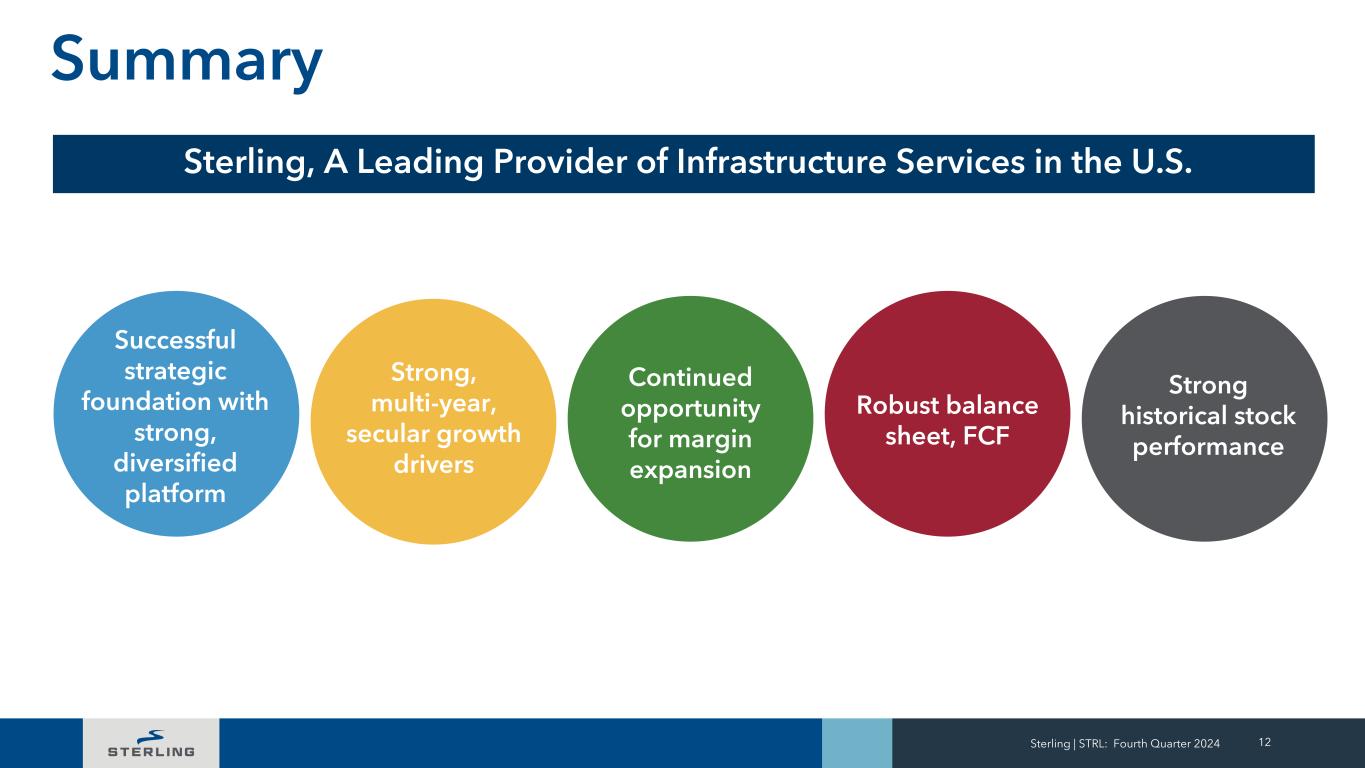 Sterling | STRL: Fourth Quarter 2024 11 Increased EBITDA and Cash Flow Drives Liquidity Strategy Debt/EBITDA Leverage Ratio 1.3X 1.0X 12/31/23 12/31/24 0.0X 0.3X 0.5X 0.8X 1.0X 1.3X We expect to pursue strategic uses of our liquidity, such as strategic acquisitions, investing in capital equipment and managing leverage. Capital allocation focus • Long-term shareholder value • Complementing organic growth in existing and new markets • Strong cash flow profile provides flexibility and drives liquidity strategy Sterling is comfortable with a Debt/EBITDA leverage ratio of +/-2.5X. 5-Year Credit Facility $317M Term Loan Borrowings $75M Revolving Credit Facility (Undrawn) Key Cash Flow Considerations Q4 YTD 2024 Q4 YTD 2023 Cash flows from Operations $497.1M $478.6M Net CAPEX $70.8M $50.6M • Cash & Cash Equivalents at December 31, 2024 was $664.2 million • 2025 EBITDA guidance(1): $370M to $395M • Expected 2025 noncash expenses: $27M to $30M (Stock-based compensation, noncash interest expense, and deferred taxes) • Scheduled term loan debt payments total $26.3 million and $6.6 million for 2025 and 2026, respectively (1) See "EBITDA Guidance Reconciliation" in the appendix for a reconciliation of GAAP to Non-GAAP measures.