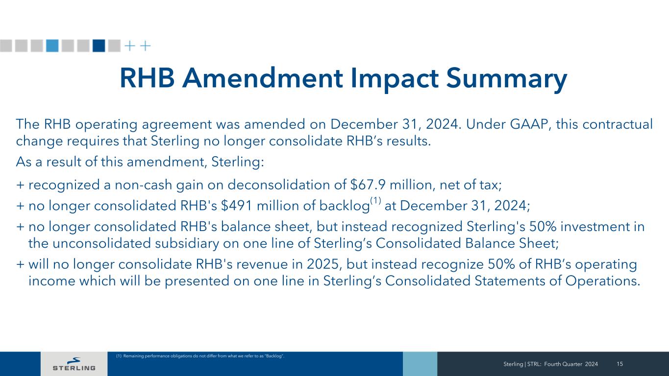 RHB Amendment Impact Summary The RHB operating agreement was amended on December 31, 2024. Under GAAP, this contractual change requires that Sterling no longer consolidate RHB’s results. As a result of this amendment, Sterling: + recognized a non-cash gain on deconsolidation of $67.9 million, net of tax; + no longer consolidated RHB's $491 million of backlog(1) at December 31, 2024; + no longer consolidated RHB's balance sheet, but instead recognized Sterling's 50% investment in the unconsolidated subsidiary on one line of Sterling’s Consolidated Balance Sheet; + will no longer consolidate RHB's revenue in 2025, but instead recognize 50% of RHB’s operating income which will be presented on one line in Sterling’s Consolidated Statements of Operations. Sterling | STRL: Fourth Quarter 2024 15 (1) Remaining performance obligations do not differ from what we refer to as “Backlog”.