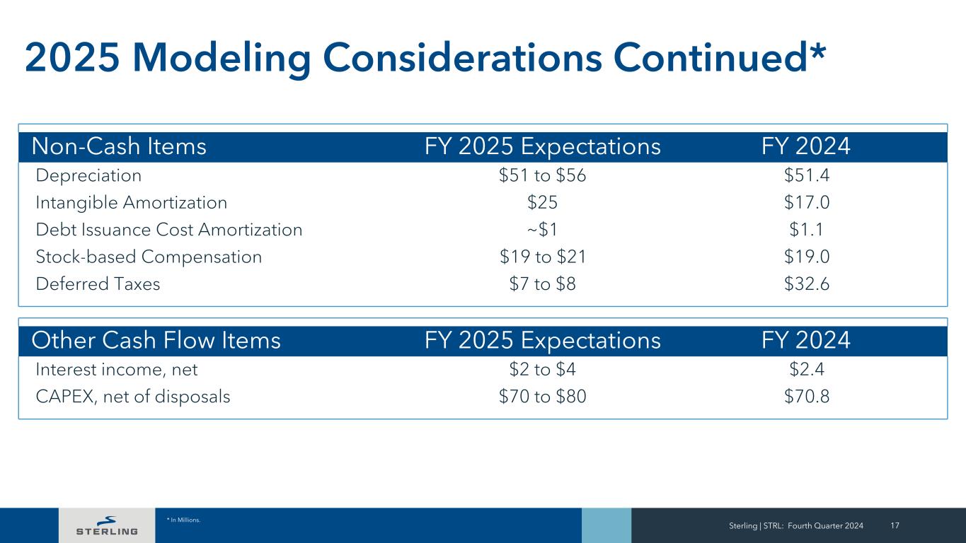 Sterling | STRL: Fourth Quarter 2024 16 2025 Modeling Considerations(1) (1) In millions except for EPS and percentages. (2) See the "Adjusted Net Income Guidance Reconciliation" on page 20. (3) See the "EBITDA Guidance Reconciliation" on page 21. Revenue $2,000 to $2,150 Gross Margin 21.0% to 22.0% G&A Expense as % of Revenue (Excluding Intangible Amortization) ~6% Other Operating Income $13 to $15 JV Non-Controlling Interest Expense ~$12 Effective Income Tax Rate ~26% Diluted EPS $6.75 to $7.25 Adjusted Diluted EPS(2) $7.90 to $8.40 Expected Dilutive Shares Outstanding 32.0 EBITDA(3) $370 to $395 Adjusted EBITDA(3) $395 to $420