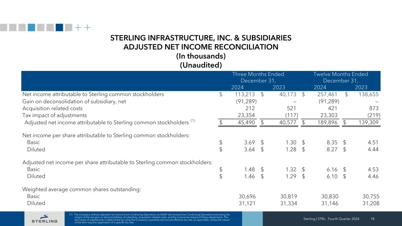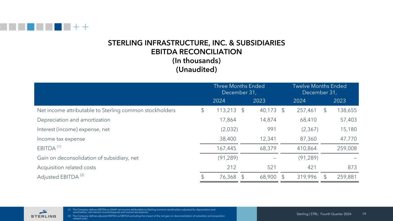 Sterling | STRL: Fourth Quarter 2024 18 (1) The Company defines adjusted net income from Continuing Operations as GAAP net income from Continuing Operations excluding the impact of the net gain on deconsolidation of subsidiary, acquisition related costs, and the income tax impact of these adjustments. The tax impact of adjustments is determined by using the Company's quarterly and annual effective tax rate, as applicable, unless the nature of the item requires application of a specific tax rate. Three Months Ended December 31, Twelve Months Ended December 31, 2024 2023 2024 2023 Net income attributable to Sterling common stockholders $ 113,213 $ 40,173 $ 257,461 $ 138,655 Gain on deconsolidation of subsidiary, net (91,289) — (91,289) — Acquisition related costs 212 521 421 873 Tax impact of adjustments 23,354 (117) 23,303 (219) Adjusted net income attributable to Sterling common stockholders (1) $ 45,490 $ 40,577 $ 189,896 $ 139,309 Net income per share attributable to Sterling common stockholders: Basic $ 3.69 $ 1.30 $ 8.35 $ 4.51 Diluted $ 3.64 $ 1.28 $ 8.27 $ 4.44 Adjusted net income per share attributable to Sterling common stockholders: Basic $ 1.48 $ 1.32 $ 6.16 $ 4.53 Diluted $ 1.46 $ 1.29 $ 6.10 $ 4.46 Weighted average common shares outstanding: Basic 30,696 30,819 30,830 30,755 Diluted 31,121 31,334 31,146 31,208 STERLING INFRASTRUCTURE, INC. & SUBSIDIARIES ADJUSTED NET INCOME RECONCILIATION (In thousands) (Unaudited)