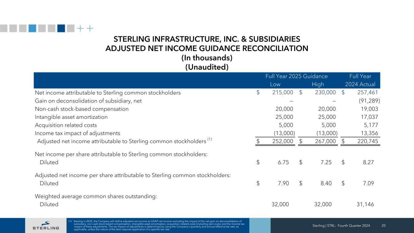 Sterling | STRL: Fourth Quarter 2024 19 (1) The Company defines EBITDA as GAAP net income attributable to Sterling common stockholders adjusted for depreciation and amortization, net interest income/expense and income tax expense. (2) The Company defines adjusted EBITDA as EBITDA excluding the impact of the net gain on deconsolidation of subsidiary and acquisition related costs. Three Months Ended December 31, Twelve Months Ended December 31, 2024 2023 2024 2023 Net income attributable to Sterling common stockholders $ 113,213 $ 40,173 $ 257,461 $ 138,655 Depreciation and amortization 17,864 14,874 68,410 57,403 Interest (income) expense, net (2,032) 991 (2,367) 15,180 Income tax expense 38,400 12,341 87,360 47,770 EBITDA (1) 167,445 68,379 410,864 259,008 Gain on deconsolidation of subsidiary, net (91,289) — (91,289) — Acquisition related costs 212 521 421 873 Adjusted EBITDA (2) $ 76,368 $ 68,900 $ 319,996 $ 259,881 STERLING INFRASTRUCTURE, INC. & SUBSIDIARIES EBITDA RECONCILIATION (In thousands) (Unaudited)