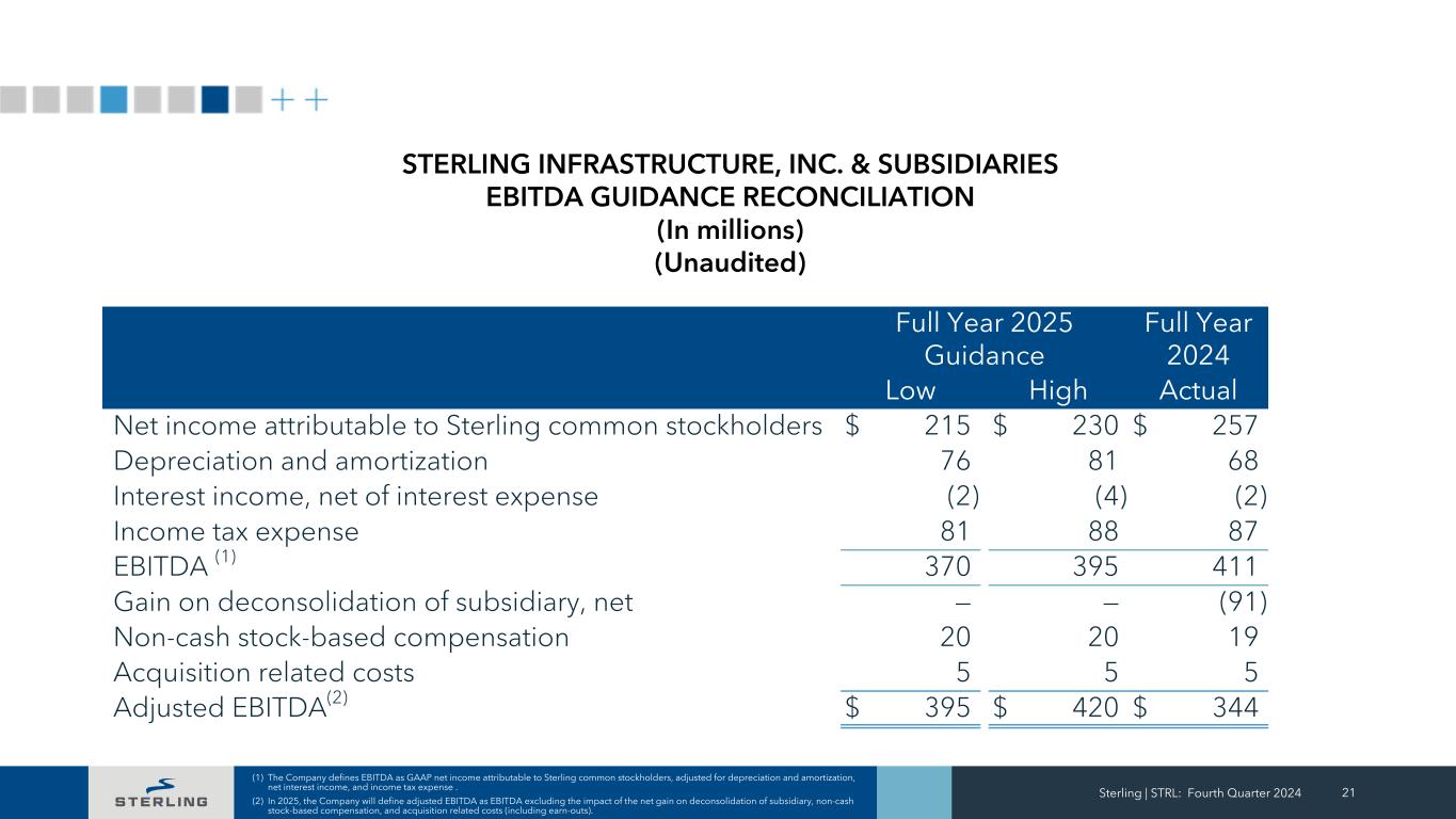 Sterling | STRL: Fourth Quarter 2024 20 (1) Starting in 2025, the Company will define adjusted net income as GAAP net income excluding the impact of the net gain on deconsolidation of subsidiary, non-cash stock-based compensation, intangible asset amortization, acquisition related costs (including earn-outs), and the income tax impact of these adjustments. The tax impact of adjustments is determined by using the Company's quarterly and annual effective tax rate, as applicable, unless the nature of the item requires application of a specific tax rate. Full Year 2025 Guidance Full Year Low High 2024 Actual Net income attributable to Sterling common stockholders $ 215,000 $ 230,000 $ 257,461 Gain on deconsolidation of subsidiary, net — — (91,289) Non-cash stock-based compensation 20,000 20,000 19,003 Intangible asset amortization 25,000 25,000 17,037 Acquisition related costs 5,000 5,000 5,177 Income tax impact of adjustments (13,000) (13,000) 13,356 Adjusted net income attributable to Sterling common stockholders (1) $ 252,000 $ 267,000 $ 220,745 Net income per share attributable to Sterling common stockholders: Diluted $ 6.75 $ 7.25 $ 8.27 Adjusted net income per share attributable to Sterling common stockholders: Diluted $ 7.90 $ 8.40 $ 7.09 Weighted average common shares outstanding: Diluted 32,000 32,000 31,146 STERLING INFRASTRUCTURE, INC. & SUBSIDIARIES ADJUSTED NET INCOME GUIDANCE RECONCILIATION (In thousands) (Unaudited)