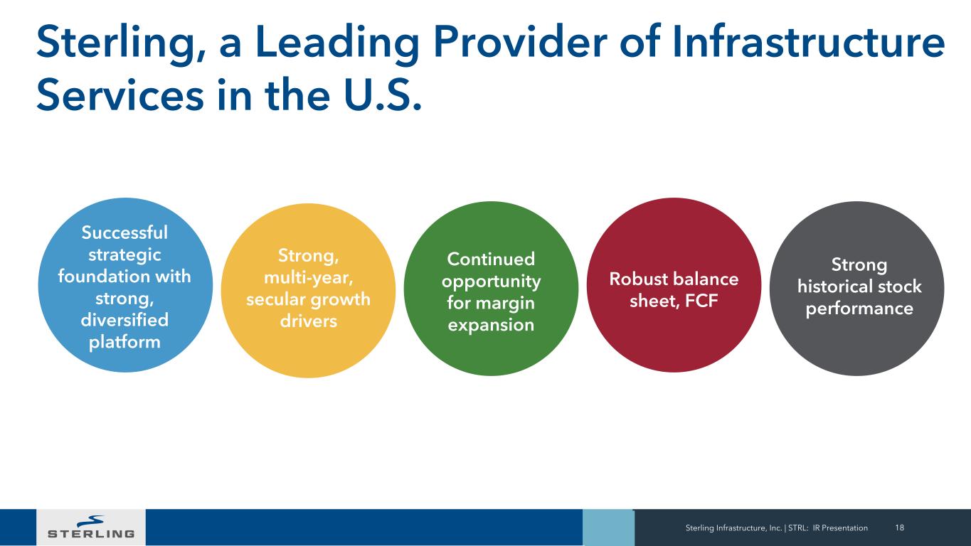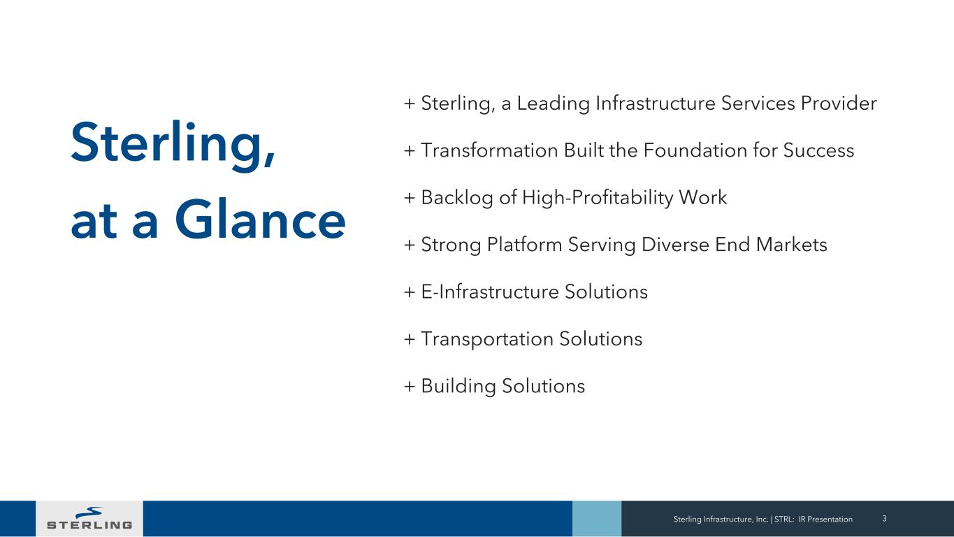 2 DISCLOSURE: Forward-Looking Statements This presentation contains, and the officers and directors of the Company may from time to time make, statements that are considered forward- looking statements within the meaning of the Securities Act of 1933 and the Securities Exchange Act of 1934. These forward-looking statements are subject to a number of risks and uncertainties, many of which are beyond our control, which may include statements about: our business strategy; our financial strategy; our industry outlook; our guidance; our expected margin growth; and our plans, objectives, expectations, forecasts, outlook and intentions. All of these types of statements, other than statements of historical fact included in this presentation, are forward-looking statements. In some cases, forward-looking statements can be identified by terminology such as “may,” “will,” “could,” "would," “should,” “expect,” “plan,” “project,” “intend,” “anticipate,” “believe,” “estimate,” “predict,” “potential,” “pursue,” “target,” "guidance," “continue,” the negative of such terms or other comparable terminology. The forward-looking statements contained in this presentation are largely based on our expectations, which reflect estimates and assumptions made by our management. These estimates and assumptions reflect our best judgment based on currently known market conditions and other factors. Although we believe such estimates and assumptions to be reasonable, they are inherently uncertain and involve a number of risks and uncertainties that are beyond our control. In addition, management’s assumptions about future events may prove to be inaccurate. Management cautions all readers that the forward-looking statements contained in this presentation are not guarantees of future performance, and we cannot assure any reader that such statements will be realized or the forward- looking events and circumstances will occur. Actual results may differ materially from those anticipated or implied in the forward-looking statements due to factors listed in the “Risk Factors” section in our filings with the U.S. Securities and Exchange Commission and elsewhere in those filings. Additional factors or risks that we currently deem immaterial, that are not presently known to us or that arise in the future could also cause our actual results to differ materially from our expected results. Given these uncertainties, investors are cautioned that many of the assumptions upon which our forward-looking statements are based are likely to change after the date the forward-looking statements are made. The forward-looking statements speak only as of the date made, and we undertake no obligation to publicly update or revise any forward- looking statements for any reason, whether as a result of new information, future events or developments, changed circumstances, or otherwise, notwithstanding any changes in our assumptions, changes in business plans, actual experience or other changes. These cautionary statements qualify all forward-looking statements attributable to us or persons acting on our behalf. This presentation may contain the financial measures: adjusted net income, EBITDA, adjusted EBITDA, and adjusted EPS, which are not calculated in accordance with U.S. GAAP. When presented, a reconciliation of the non-GAAP financial measures to the most directly comparable GAAP financial measure will be provided in the Appendix to this presentation. Sterling Infrastructure, Inc. | STRL: IR Presentation