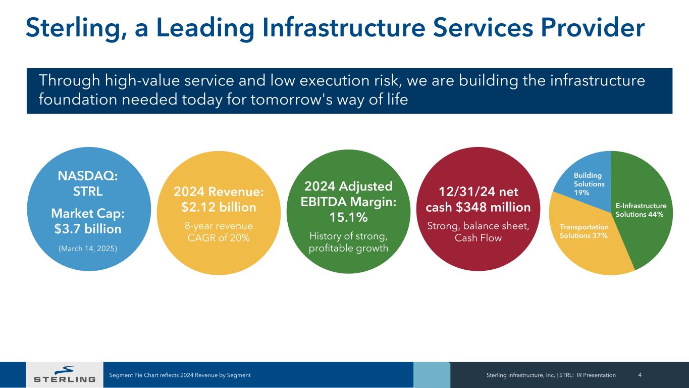 Sterling, at a Glance Sterling Infrastructure, Inc. | STRL: IR Presentation 3 + Sterling, a Leading Infrastructure Services Provider + Transformation Built the Foundation for Success + Backlog of High-Profitability Work + Strong Platform Serving Diverse End Markets + E-Infrastructure Solutions + Transportation Solutions + Building Solutions