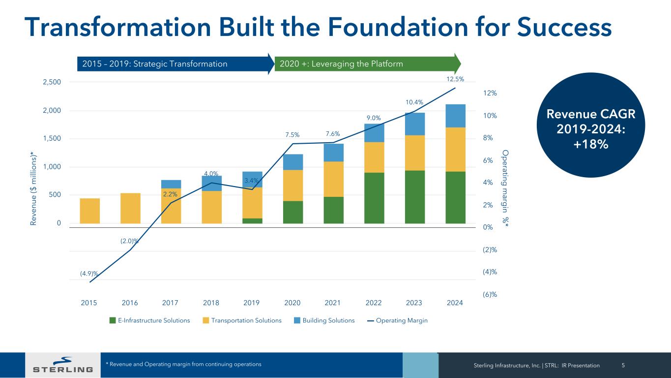 4 Sterling, a Leading Infrastructure Services Provider Sterling Infrastructure, Inc. | STRL: IR Presentation E-Infrastructure Solutions 44% Transportation Solutions 37% Building Solutions 19% NASDAQ: STRL Market Cap: $3.7 billion (March 14, 2025) 2024 Adjusted EBITDA Margin: 15.1% History of strong, profitable growth 2024 Revenue: $2.12 billion 8-year revenue CAGR of 20% 12/31/24 net cash $348 million Strong, balance sheet, Cash Flow Through high-value service and low execution risk, we are building the infrastructure foundation needed today for tomorrow's way of life Segment Pie Chart reflects 2024 Revenue by Segment