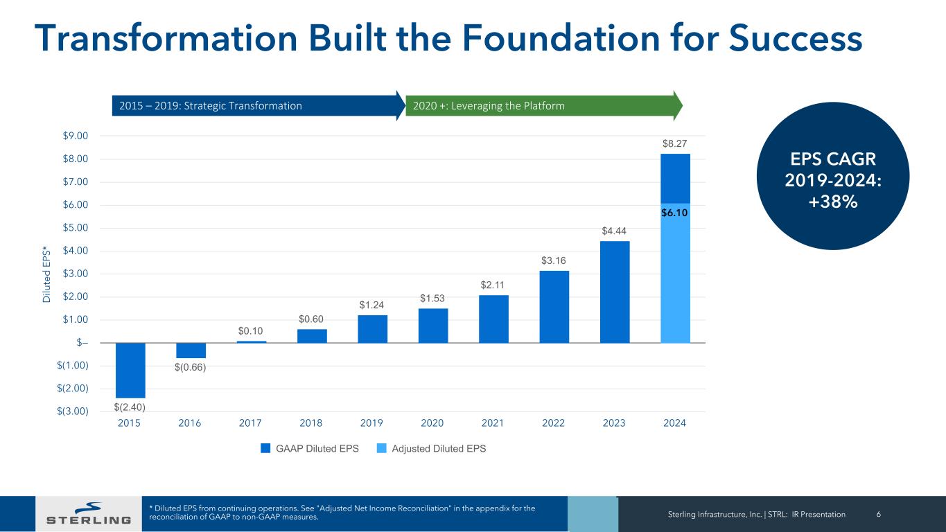 Sterling Infrastructure, Inc. | STRL: IR Presentation 5 Revenue CAGR 2019-2024: +18% R ev en ue ($ m ill io ns )* O p erating m arg in % * (4.9)% (2.0)% 2.2% 4.0% 3.4% 7.5% 7.6% 9.0% 10.4% 12.5% E-Infrastructure Solutions Transportation Solutions Building Solutions Operating Margin 2015 2016 2017 2018 2019 2020 2021 2022 2023 2024 -1,000 -500 0 500 1,000 1,500 2,000 2,500 (6)% (4)% (2)% 0% 2% 4% 6% 8% 10% 12% 2015 – 2019: Strategic Transformation 2020 +: Leveraging the Platform Transformation Built the Foundation for Success * Revenue and Operating margin from continuing operations
