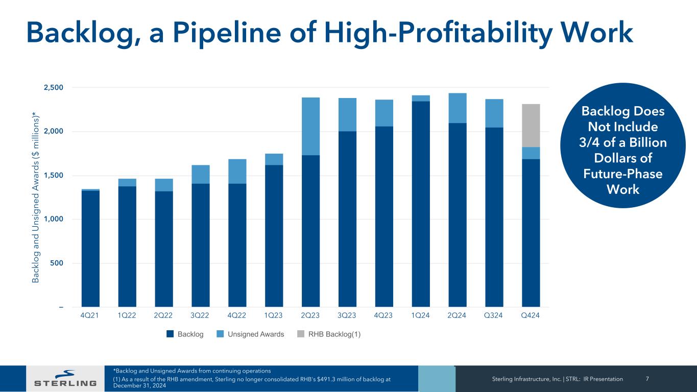 Sterling Infrastructure, Inc. | STRL: IR Presentation 6 EPS CAGR 2019-2024: +38% 2015 – 2019: Strategic Transformation 2020 +: Leveraging the Platform Transformation Built the Foundation for Success * Diluted EPS from continuing operations. See "Adjusted Net Income Reconciliation" in the appendix for the reconciliation of GAAP to non-GAAP measures. D ilu te d E PS * $0.10 $0.60 $1.24 $1.53 $2.11 $3.16 $4.44 $8.27 $(2.40) $(0.66) $6.10 GAAP Diluted EPS Adjusted Diluted EPS 2015 2016 2017 2018 2019 2020 2021 2022 2023 2024 $(3.00) $(2.00) $(1.00) $— $1.00 $2.00 $3.00 $4.00 $5.00 $6.00 $7.00 $8.00 $9.00