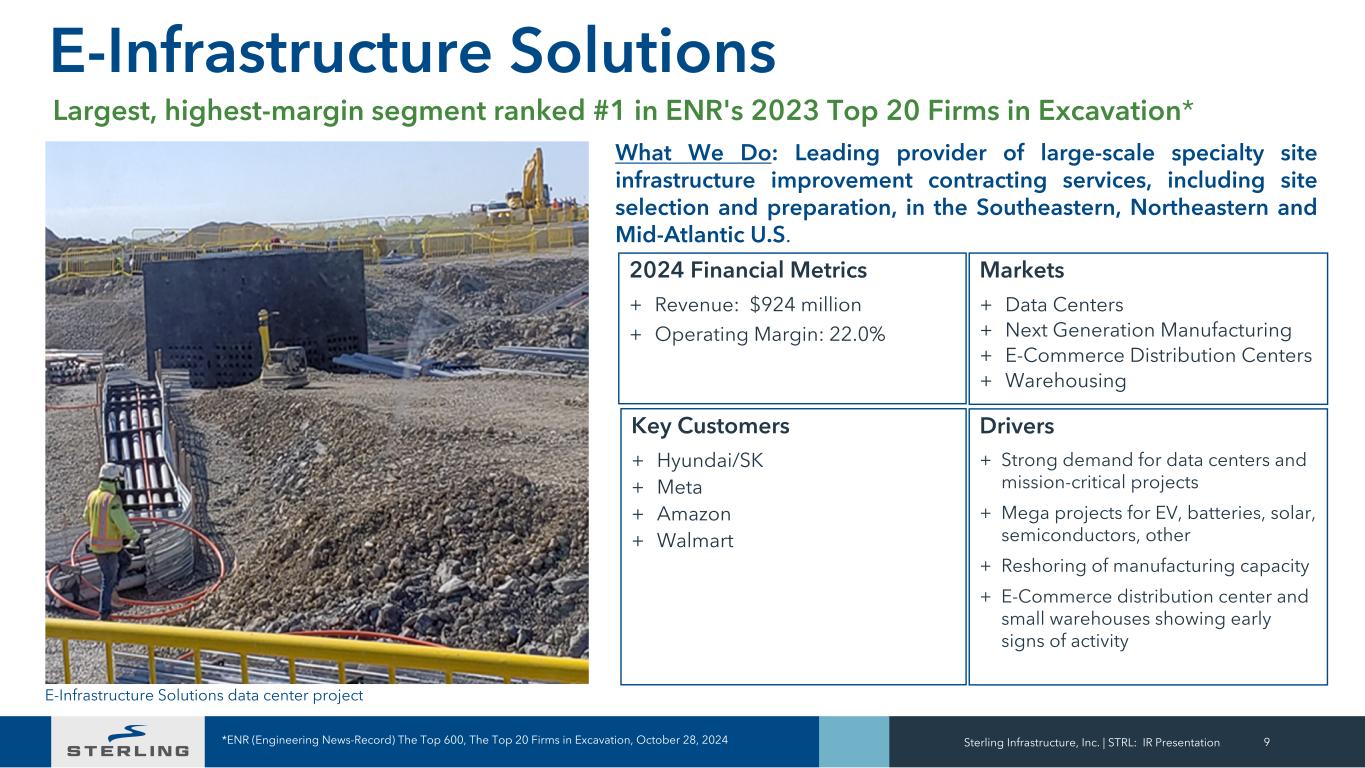 E-Infrastructure Solutions Markets + Data Centers + Next Generation Manufacturing + E-Commerce Distribution Centers + Warehousing What We Do: Leading provider of large-scale specialty site infrastructure improvement contracting services, including site selection and preparation, in the Southeastern, Northeastern and Mid-Atlantic U.S. E-Infrastructure Solutions data center project 2024 Financial Metrics + Revenue: $924 million + Operating Margin: 22.0% Drivers + Strong demand for data centers and mission-critical projects + Mega projects for EV, batteries, solar, semiconductors, other + Reshoring of manufacturing capacity + E-Commerce distribution center and small warehouses showing early signs of activity Key Customers + Hyundai/SK + Meta + Amazon + Walmart Sterling Infrastructure, Inc. | STRL: IR Presentation 9 Largest, highest-margin segment ranked #1 in ENR's 2023 Top 20 Firms in Excavation* *ENR (Engineering News-Record) The Top 600, The Top 20 Firms in Excavation, October 28, 2024