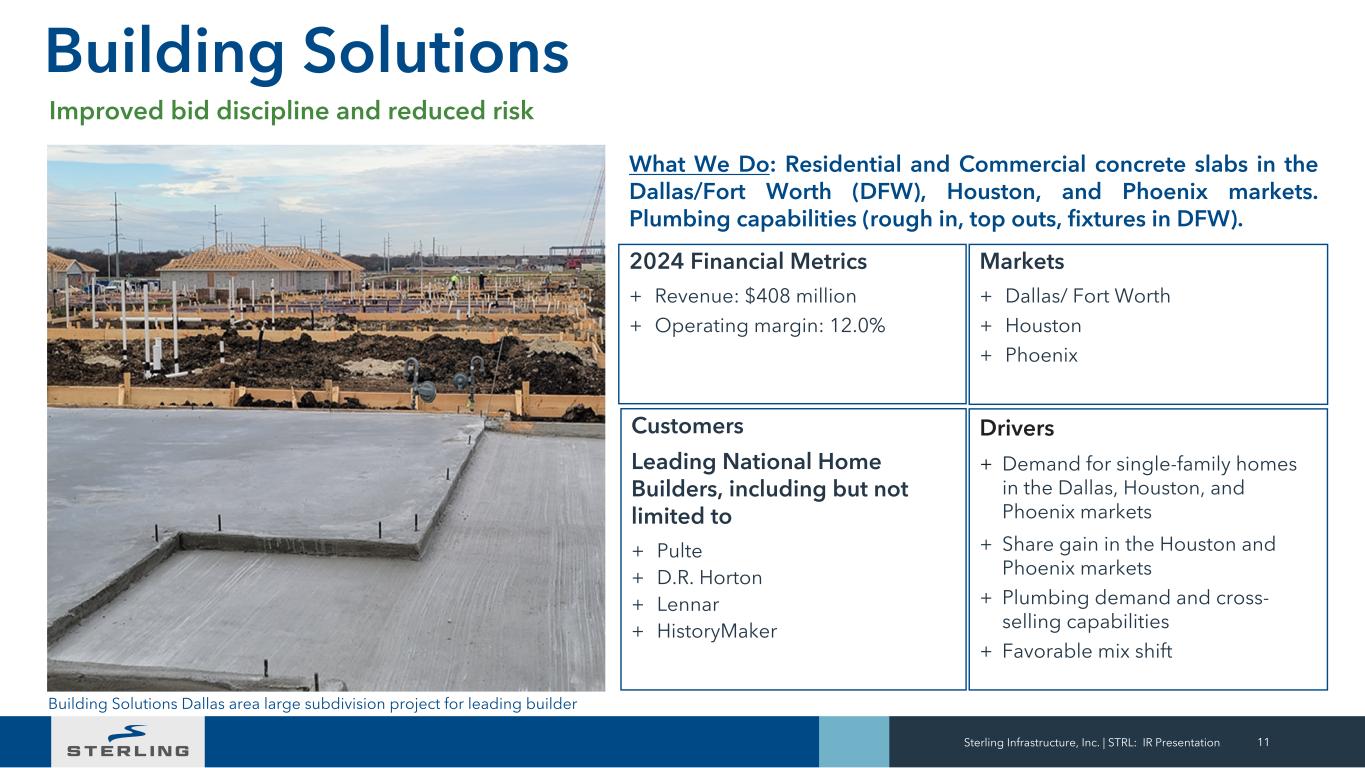 What We Do: Infrastructure and rehabilitation projects for highways, roads, bridges, airports, ports, light rail and storm drainage systems in the Rocky Mountain regions, Pacific Islands and Texas. Transportation Solutions Wildlife Crossing Bridge project Sterling Infrastructure, Inc. | STRL: IR Presentation 10 Transportation Solutions Strong markets with attractive margin opportunities 2024 Financial Metrics + Revenue: $784 million + Operating Margin: 6.5% Markets + Low-bid Heavy Highway + Alternative FD + Aviation + Rail Primary Geographies + Arizona + Colorado + Hawaii + Nevada + Texas + Utah Drivers + Strong state and local funding + Infrastructure Bill allocates $643B for transportation programs ($284B incremental), $25B for airports over 5 years + Over $185B in IIJA funding for 7,000+ transportation projects announced in 2022