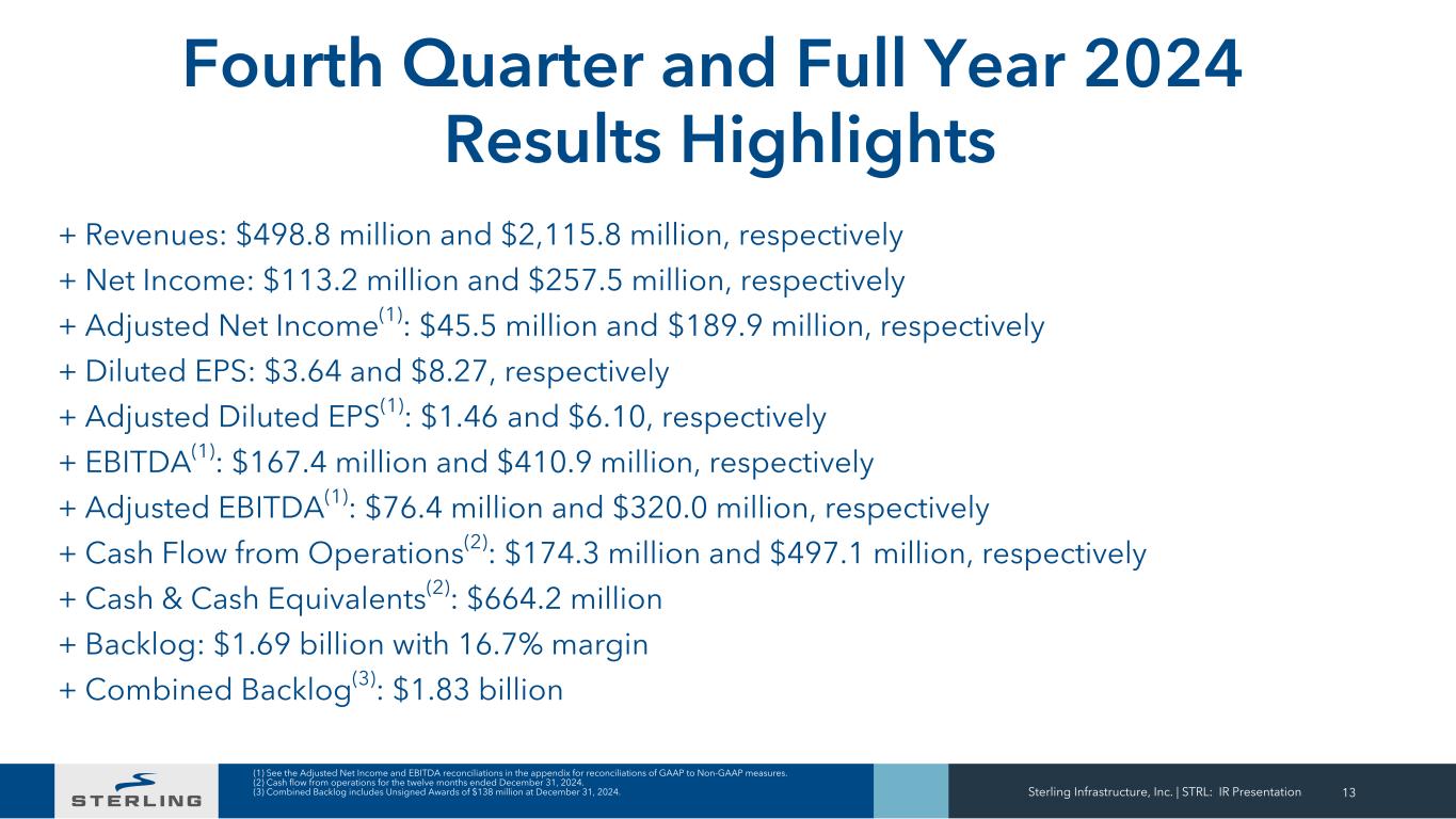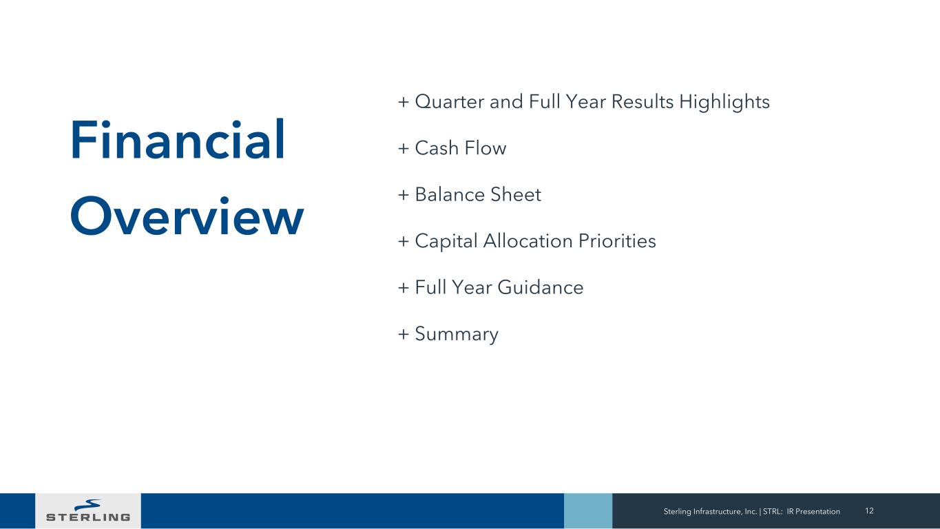 Financial Overview Sterling Infrastructure, Inc. | STRL: IR Presentation 12 + Quarter and Full Year Results Highlights + Cash Flow + Balance Sheet + Capital Allocation Priorities + Full Year Guidance + Summary