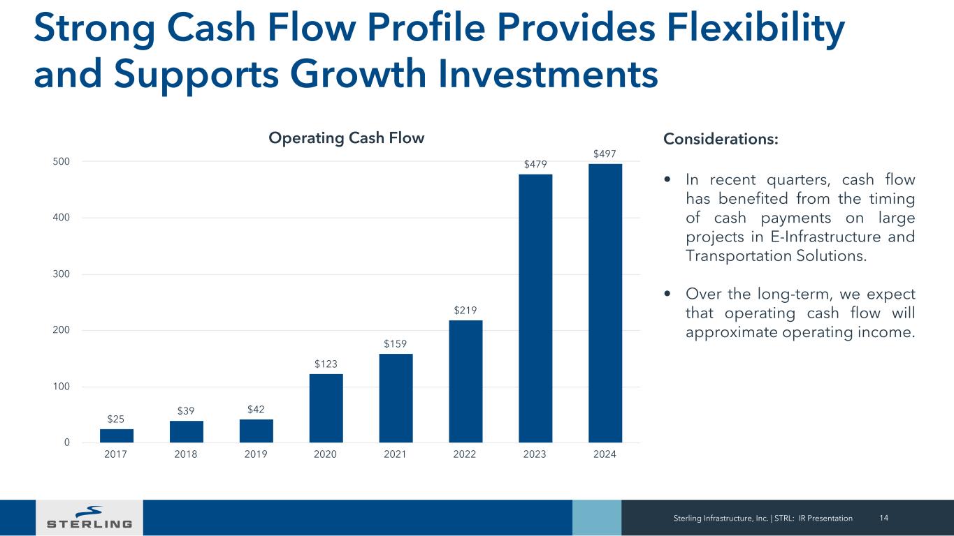 13 (1) See the Adjusted Net Income and EBITDA reconciliations in the appendix for reconciliations of GAAP to Non-GAAP measures. (2) Cash flow from operations for the twelve months ended December 31, 2024. (3) Combined Backlog includes Unsigned Awards of $138 million at December 31, 2024. Fourth Quarter and Full Year 2024 + Revenues: $498.8 million and $2,115.8 million, respectively + Net Income: $113.2 million and $257.5 million, respectively + Adjusted Net Income(1): $45.5 million and $189.9 million, respectively + Diluted EPS: $3.64 and $8.27, respectively + Adjusted Diluted EPS(1): $1.46 and $6.10, respectively + EBITDA(1): $167.4 million and $410.9 million, respectively + Adjusted EBITDA(1): $76.4 million and $320.0 million, respectively + Cash Flow from Operations(2): $174.3 million and $497.1 million, respectively + Cash & Cash Equivalents(2): $664.2 million + Backlog: $1.69 billion with 16.7% margin + Combined Backlog(3): $1.83 billion Sterling Infrastructure, Inc. | STRL: IR Presentation Results Highlights