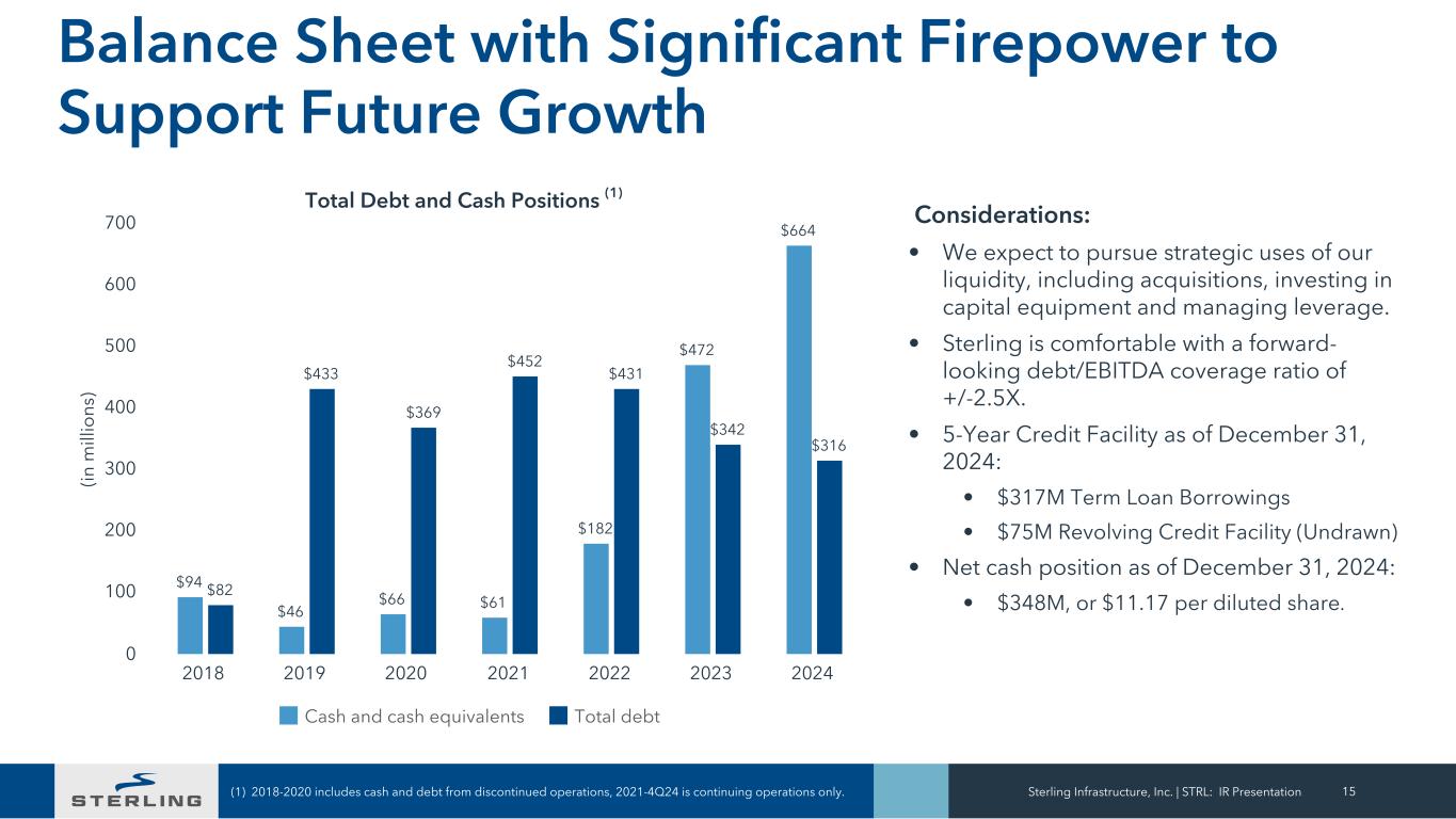 14 Strong Cash Flow Profile Provides Flexibility and Supports Growth Investments Sterling Infrastructure, Inc. | STRL: IR Presentation Considerations: • In recent quarters, cash flow has benefited from the timing of cash payments on large projects in E-Infrastructure and Transportation Solutions. • Over the long-term, we expect that operating cash flow will approximate operating income. Operating Cash Flow $25 $39 $42 $123 $159 $219 $479 $497 2017 2018 2019 2020 2021 2022 2023 2024 0 100 200 300 400 500