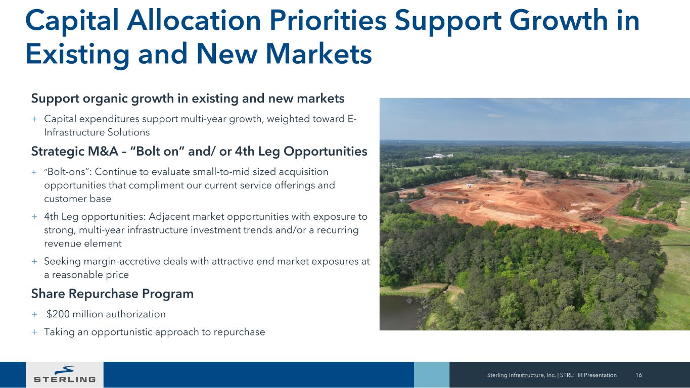 15 Balance Sheet with Significant Firepower to Support Future Growth (1) 2018-2020 includes cash and debt from discontinued operations, 2021-4Q24 is continuing operations only. Considerations: • We expect to pursue strategic uses of our liquidity, including acquisitions, investing in capital equipment and managing leverage. • Sterling is comfortable with a forward- looking debt/EBITDA coverage ratio of +/-2.5X. • 5-Year Credit Facility as of December 31, 2024: • $317M Term Loan Borrowings • $75M Revolving Credit Facility (Undrawn) • Net cash position as of December 31, 2024: • $348M, or $11.17 per diluted share. Sterling Infrastructure, Inc. | STRL: IR Presentation (in m ill io ns ) $94 $46 $66 $61 $182 $472 $664 $82 $433 $369 $452 $431 $342 $316 Cash and cash equivalents Total debt 2018 2019 2020 2021 2022 2023 2024 0 100 200 300 400 500 600 700 Total Debt and Cash Positions (1)