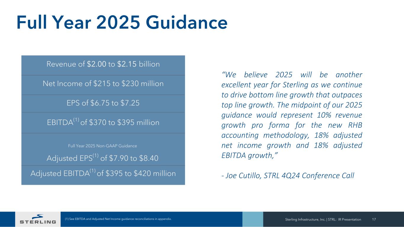 Adjusted EPS(1) of $7.90 to $8.40 Net Income of $215 to $230 million EBITDA(1) of $370 to $395 million Revenue of $2.00 to $2.15 billion EPS of $6.75 to $7.25 Full Year 2025 Guidance (1) See EBITDA and Adjusted Net Income guidance reconciliations in appendix. Sterling Infrastructure, Inc. | STRL: IR Presentation 17 “We believe 2025 will be another excellent year for Sterling as we continue to drive bottom line growth that outpaces top line growth. The midpoint of our 2025 guidance would represent 10% revenue growth pro forma for the new RHB accounting methodology, 18% adjusted net income growth and 18% adjusted EBITDA growth,” - Joe Cutillo, STRL 4Q24 Conference Call Adjusted EBITDA(1) of $395 to $420 million Full Year 2025 Non-GAAP Guidance