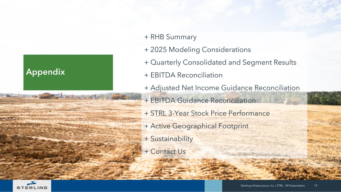 + Appendix Sterling Infrastructure, Inc. | STRL: IR Presentation 19 + RHB Summary + 2025 Modeling Considerations + Quarterly Consolidated and Segment Results + EBITDA Reconciliation + Adjusted Net Income Guidance Reconciliation + EBITDA Guidance Reconciliation + STRL 3-Year Stock Price Performance + Active Geographical Footprint + Sustainability + Contact Us