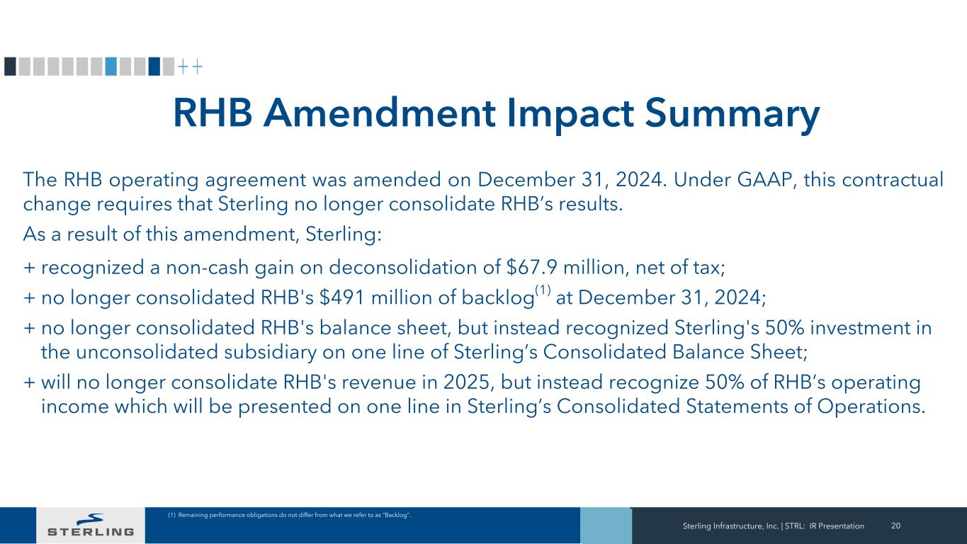 Sterling Infrastructure, Inc. | STRL: IR Presentation 20 RHB Amendment Impact Summary The RHB operating agreement was amended on December 31, 2024. Under GAAP, this contractual change requires that Sterling no longer consolidate RHB’s results. As a result of this amendment, Sterling: + recognized a non-cash gain on deconsolidation of $67.9 million, net of tax; + no longer consolidated RHB's $491 million of backlog(1) at December 31, 2024; + no longer consolidated RHB's balance sheet, but instead recognized Sterling's 50% investment in the unconsolidated subsidiary on one line of Sterling’s Consolidated Balance Sheet; + will no longer consolidate RHB's revenue in 2025, but instead recognize 50% of RHB’s operating income which will be presented on one line in Sterling’s Consolidated Statements of Operations. (1) Remaining performance obligations do not differ from what we refer to as “Backlog”.