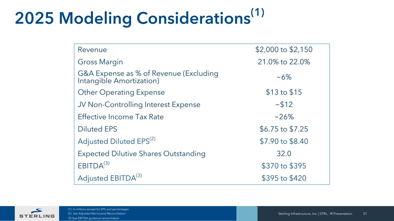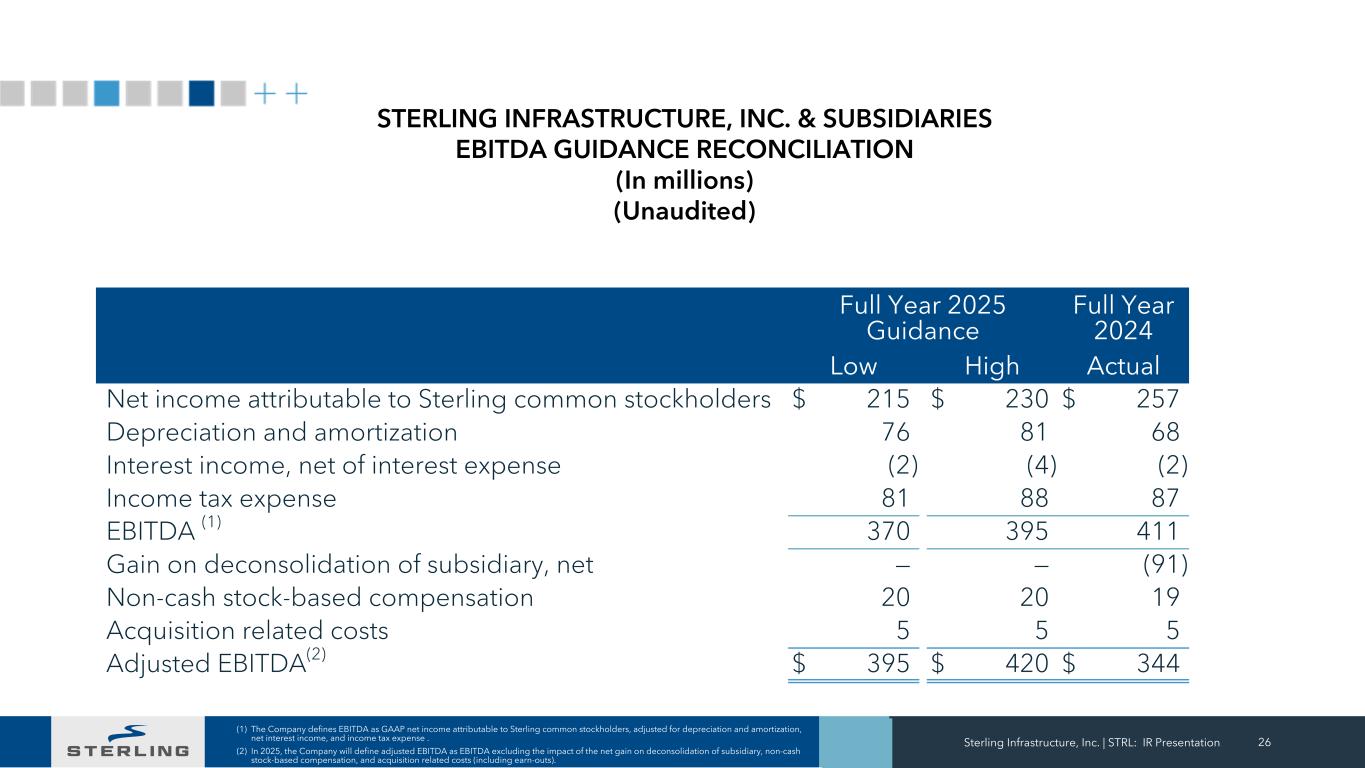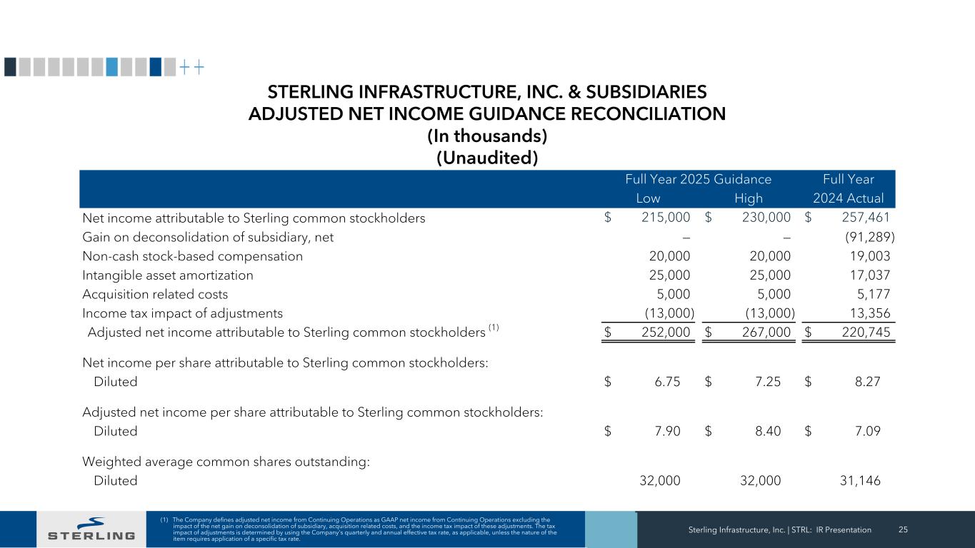 STERLING INFRASTRUCTURE, INC. & SUBSIDIARIES ADJUSTED NET INCOME GUIDANCE RECONCILIATION (In thousands) (Unaudited) Full Year 2025 Guidance Full Year Low High 2024 Actual Net income attributable to Sterling common stockholders $ 215,000 $ 230,000 $ 257,461 Gain on deconsolidation of subsidiary, net — — (91,289) Non-cash stock-based compensation 20,000 20,000 19,003 Intangible asset amortization 25,000 25,000 17,037 Acquisition related costs 5,000 5,000 5,177 Income tax impact of adjustments (13,000) (13,000) 13,356 Adjusted net income attributable to Sterling common stockholders (1) $ 252,000 $ 267,000 $ 220,745 Net income per share attributable to Sterling common stockholders: Diluted $ 6.75 $ 7.25 $ 8.27 Adjusted net income per share attributable to Sterling common stockholders: Diluted $ 7.90 $ 8.40 $ 7.09 Weighted average common shares outstanding: Diluted 32,000 32,000 31,146 (1) The Company defines adjusted net income from Continuing Operations as GAAP net income from Continuing Operations excluding the impact of the net gain on deconsolidation of subsidiary, acquisition related costs, and the income tax impact of these adjustments. The tax impact of adjustments is determined by using the Company's quarterly and annual effective tax rate, as applicable, unless the nature of the item requires application of a specific tax rate. Sterling Infrastructure, Inc. | STRL: IR Presentation 25