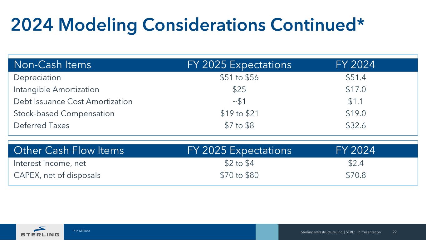 21 (1) In millions except for EPS and percentages (2) See Adjusted Net Income Reconciliation (3) See EBITDA guidance reconciliation Sterling Infrastructure, Inc. | STRL: IR Presentation 2025 Modeling Considerations(1) Revenue $2,000 to $2,150 Gross Margin 21.0% to 22.0% G&A Expense as % of Revenue (Excluding Intangible Amortization) ~6% Other Operating Expense $13 to $15 JV Non-Controlling Interest Expense ~$12 Effective Income Tax Rate ~26% Diluted EPS $6.75 to $7.25 Adjusted Diluted EPS(2) $7.90 to $8.40 Expected Dilutive Shares Outstanding 32.0 EBITDA(3) $370 to $395 Adjusted EBITDA(3) $395 to $420