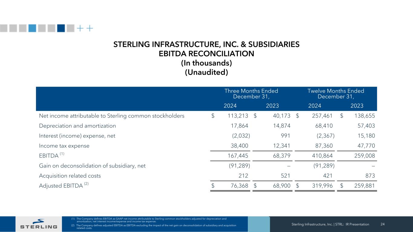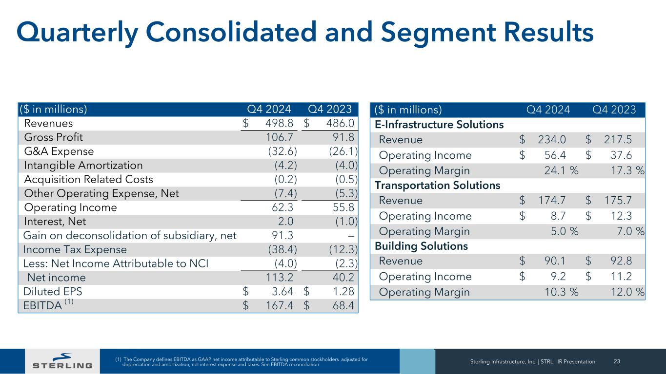23 Quarterly Consolidated and Segment Results ($ in millions) Q4 2024 Q4 2023 Revenues $ 498.8 $ 486.0 Gross Profit 106.7 91.8 G&A Expense (32.6) (26.1) Intangible Amortization (4.2) (4.0) Acquisition Related Costs (0.2) (0.5) Other Operating Expense, Net (7.4) (5.3) Operating Income 62.3 55.8 Interest, Net 2.0 (1.0) Gain on deconsolidation of subsidiary, net 91.3 — Income Tax Expense (38.4) (12.3) Less: Net Income Attributable to NCI (4.0) (2.3) Net income 113.2 40.2 Diluted EPS $ 3.64 $ 1.28 EBITDA (1) $ 167.4 $ 68.4 ($ in millions) Q4 2024 Q4 2023 E-Infrastructure Solutions Revenue $ 234.0 $ 217.5 Operating Income $ 56.4 $ 37.6 Operating Margin 24.1 % 17.3 % Transportation Solutions Revenue $ 174.7 $ 175.7 Operating Income $ 8.7 $ 12.3 Operating Margin 5.0 % 7.0 % Building Solutions Revenue $ 90.1 $ 92.8 Operating Income $ 9.2 $ 11.2 Operating Margin 10.3 % 12.0 % (1) The Company defines EBITDA as GAAP net income attributable to Sterling common stockholders  adjusted for depreciation and amortization, net interest expense and taxes. See EBITDA reconciliation Sterling Infrastructure, Inc. | STRL: IR Presentation