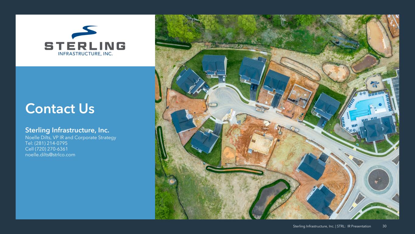 Protecting Our Environment + Sound governance + Environmentally responsible construction services and solutions for today and tomorrow Taking Care of Our People + Sterling’s safety rating consistently ranks 10X better than the industry average + Employee wellness programs through extensive benefit offerings + Training & Development programs, including the new focused training through Sterling Academy + Caring for our communities and supporting organizations across our footprint and beyond Governance + Committed to conducting business ethically and with integrity and full transparency + Committed to strong and effective governance practices that promote and protect the interests of our shareholders Sustainability From strategy to operations, we are committed to sustainability by operating responsibly to safeguard and improve society’s quality of life. In 2022, we published Building a Better Tomorrow, The Sterling Way – 2022 Sustainability Report to share our sustainability practices, goals and initiatives. This year, we published Leading The Way, The Sterling Way – 2023 Sustainability Report. Both reports can be accessed via the Sterling Way (ESG) section of our website https://www.strlco.com/sustainability/ Sterling Infrastructure, Inc. | STRL: IR Presentation 29