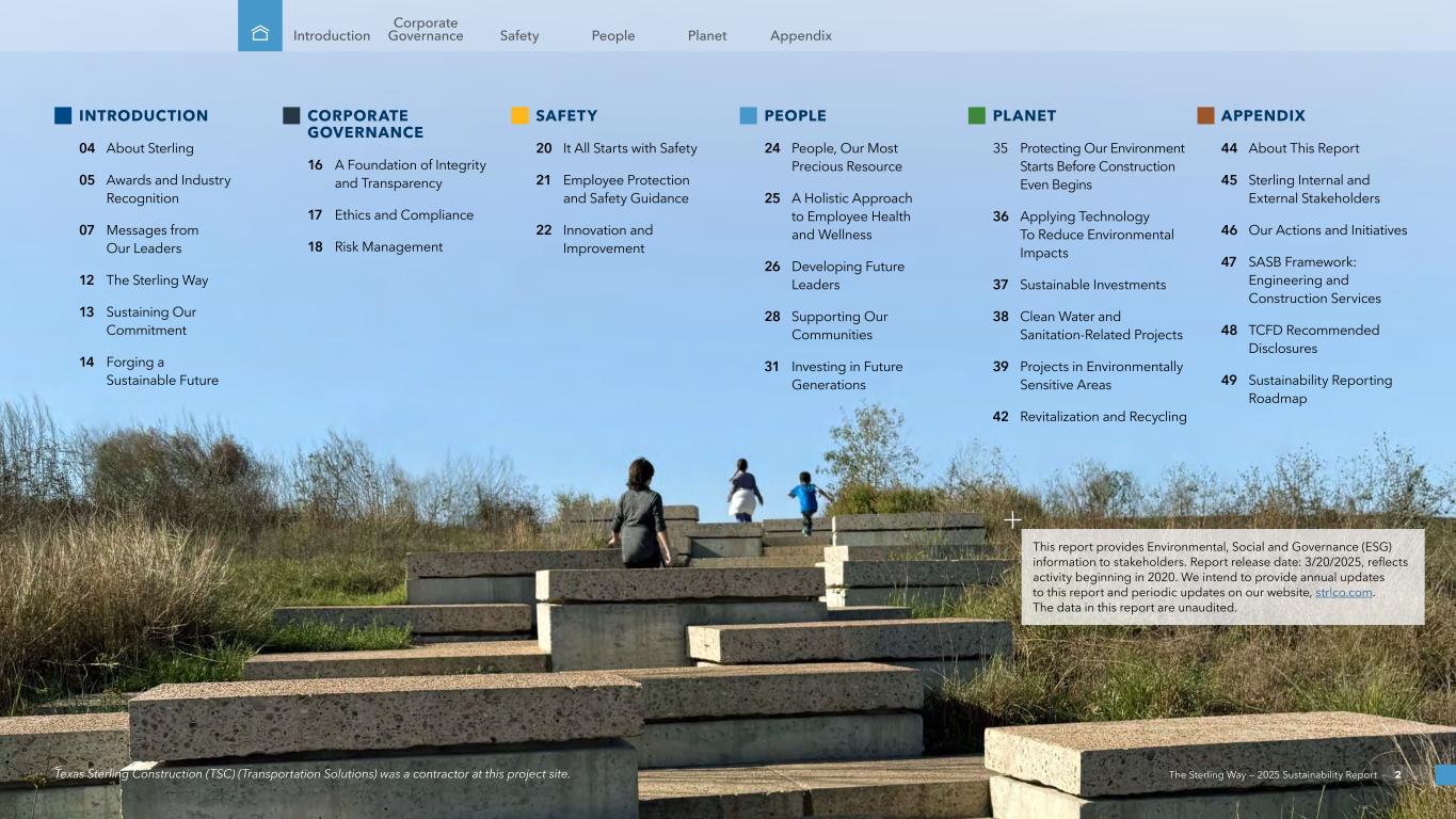 Texas Sterling Construction (TSC) (Transportation Solutions) was a contractor at this project site. The Sterling Way — 2025 Sustainability Report 2 INTRODUCTION 04 About Sterling 05 Awards and Industry Recognition 07 Messages from Our Leaders 12 The Sterling Way 13 Sustaining Our Commitment 14 Forging a Sustainable Future CORPORATE GOVERNANCE 16 A Foundation of Integrity and Transparency 17 Ethics and Compliance 18 Risk Management SAFETY 20 It All Starts with Safety 21 Employee Protection and Safety Guidance 22 Innovation and Improvement PEOPLE 24 People, Our Most Precious Resource 25 A Holistic Approach to Employee Health and Wellness 26 Developing Future Leaders 28 Supporting Our Communities 31 Investing in Future Generations PLANET 35 Protecting Our Environment Starts Before Construction Even Begins 36 Applying Technology To Reduce Environmental Impacts 37 Sustainable Investments 38 Clean Water and Sanitation-Related Projects 39 Projects in Environmentally Sensitive Areas 42 Revitalization and Recycling APPENDIX 44 About This Report 45 Sterling Internal and External Stakeholders 46 Our Actions and Initiatives 47 SASB Framework: Engineering and Construction Services 48 TCFD Recommended Disclosures 49 Sustainability Reporting Roadmap This report provides Environmental, Social and Governance (ESG) information to stakeholders. Report release date: 3/20/2025, reflects activity beginning in 2020. We intend to provide annual updates to this report and periodic updates on our website, strlco.com. The data in this report are unaudited. AppendixPlanetPeopleSafety Corporate GovernanceIntroduction