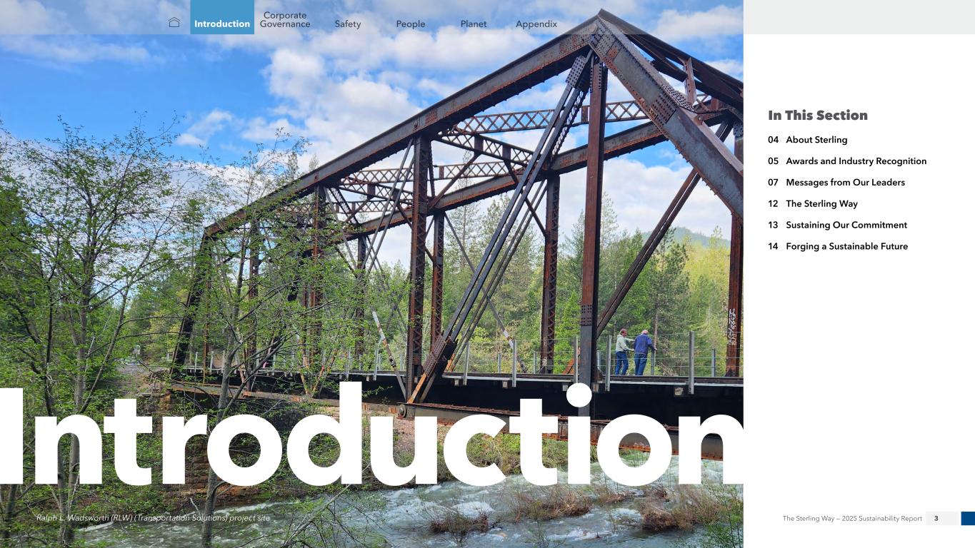 The Sterling Way — 2025 Sustainability Report 3 In This Section 04 About Sterling 05 Awards and Industry Recognition 07 Messages from Our Leaders 12 The Sterling Way 13 Sustaining Our Commitment 14 Forging a Sustainable Future Ralph L. Wadsworth (RLW) (Transportation Solutions) project site Introduction Corporate Governance Safety People Planet Appendix