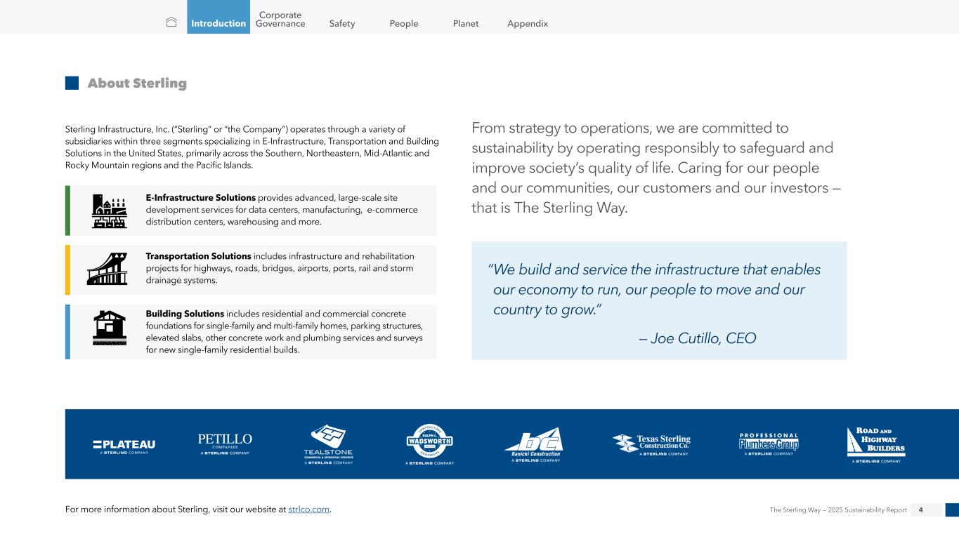 The Sterling Way — 2025 Sustainability Report 4 About Sterling Sterling Infrastructure, Inc. (“Sterling” or “the Company”) operates through a variety of subsidiaries within three segments specializing in E-Infrastructure, Transportation and Building Solutions in the United States, primarily across the Southern, Northeastern, Mid-Atlantic and Rocky Mountain regions and the Pacific Islands. E-Infrastructure Solutions provides advanced, large-scale site development services for data centers, manufacturing, e-commerce distribution centers, warehousing and more. Transportation Solutions includes infrastructure and rehabilitation projects for highways, roads, bridges, airports, ports, rail and storm drainage systems. Building Solutions includes residential and commercial concrete foundations for single-family and multi-family homes, parking structures, elevated slabs, other concrete work and plumbing services and surveys for new single-family residential builds. From strategy to operations, we are committed to sustainability by operating responsibly to safeguard and improve society’s quality of life. Caring for our people and our communities, our customers and our investors — that is The Sterling Way. For more information about Sterling, visit our website at strlco.com. “ We build and service the infrastructure that enables our economy to run, our people to move and our country to grow.” — Joe Cutillo, CEO Safety Corporate Governance People AppendixPlanetIntroduction