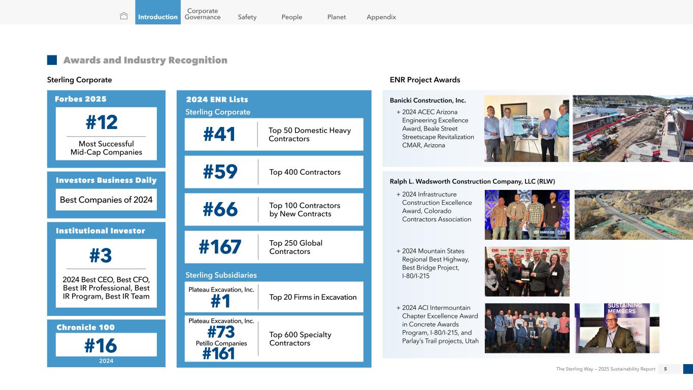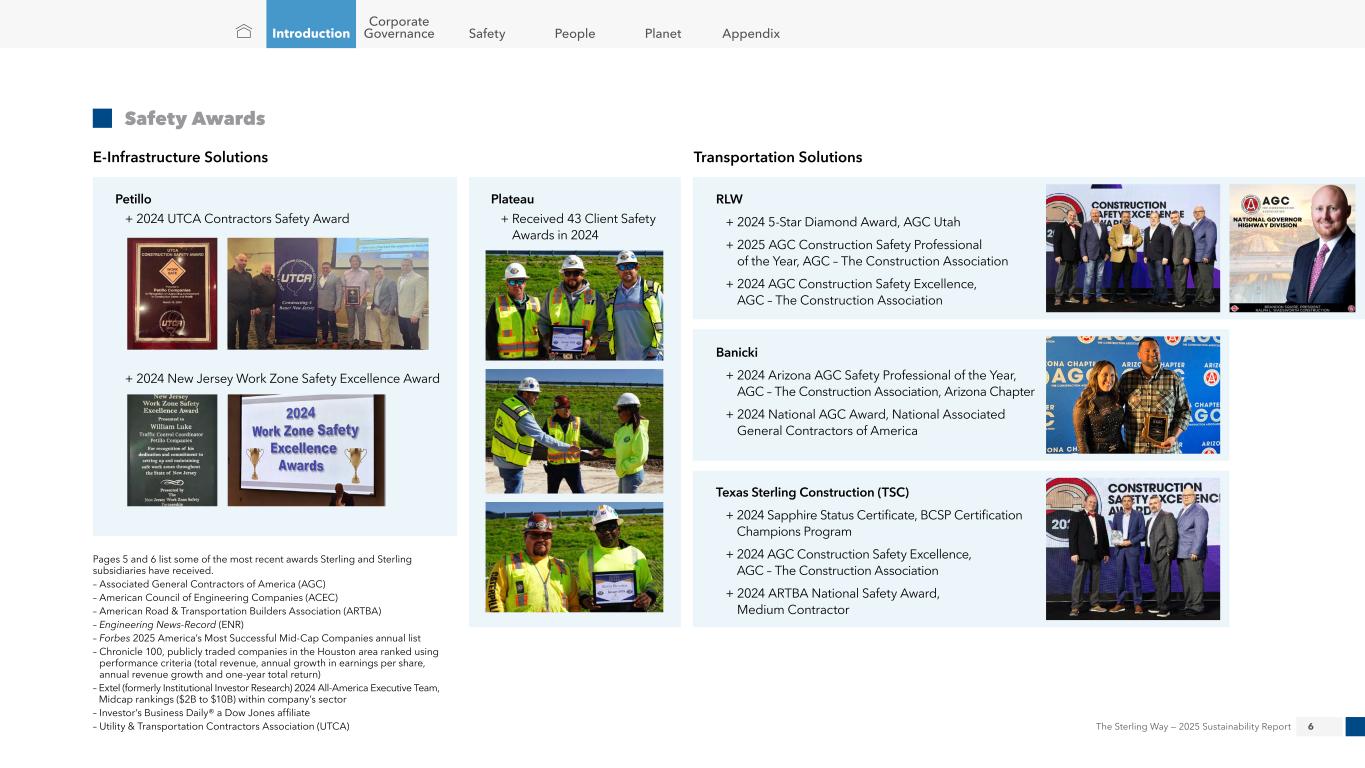 The Sterling Way — 2025 Sustainability Report 6 Safety Awards Petillo + 2024 UTCA Contractors Safety Award Plateau + Received 43 Client Safety Awards in 2024 RLW + 2024 5-Star Diamond Award, AGC Utah + 2025 AGC Construction Safety Professional of the Year, AGC – The Construction Association + 2024 AGC Construction Safety Excellence, AGC – The Construction Association Banicki + 2024 Arizona AGC Safety Professional of the Year, AGC – The Construction Association, Arizona Chapter + 2024 National AGC Award, National Associated General Contractors of America Texas Sterling Construction (TSC) + 2024 Sapphire Status Certificate, BCSP Certification Champions Program + 2024 AGC Construction Safety Excellence, AGC – The Construction Association + 2024 ARTBA National Safety Award, Medium Contractor Transportation SolutionsE-Infrastructure Solutions Pages 5 and 6 list some of the most recent awards Sterling and Sterling subsidiaries have received. – Associated General Contractors of America (AGC) – American Council of Engineering Companies (ACEC) – American Road & Transportation Builders Association (ARTBA) – Engineering News-Record (ENR) – Forbes 2025 America’s Most Successful Mid-Cap Companies annual list – Chronicle 100, publicly traded companies in the Houston area ranked using performance criteria (total revenue, annual growth in earnings per share, annual revenue growth and one-year total return) – Extel (formerly Institutional Investor Research) 2024 All-America Executive Team, Midcap rankings ($2B to $10B) within company’s sector – Investor’s Business Daily® a Dow Jones affiliate – Utility & Transportation Contractors Association (UTCA) + 2024 New Jersey Work Zone Safety Excellence Award Safety Corporate Governance People AppendixPlanetIntroduction