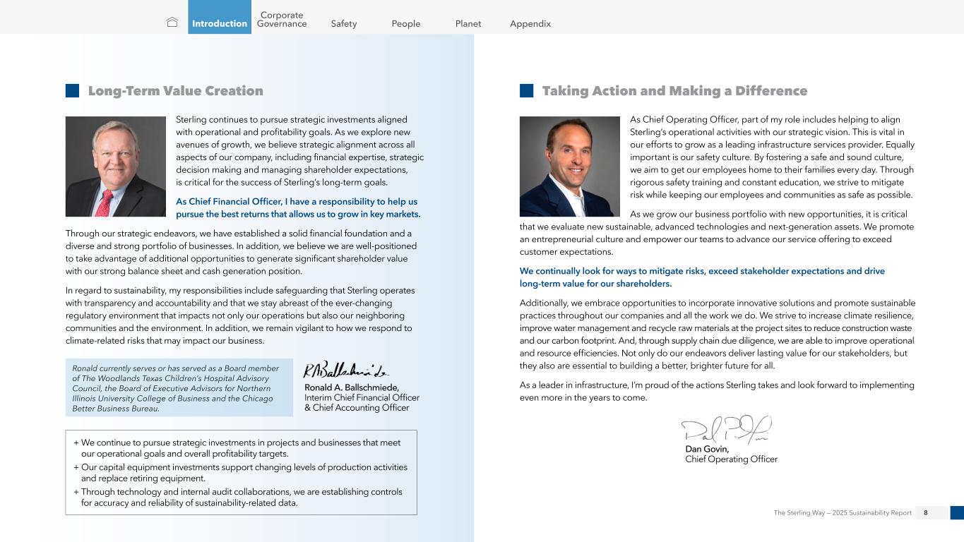 Long-Term Value Creation Taking Action and Making a Difference The Sterling Way — 2025 Sustainability Report 8 As Chief Operating Officer, part of my role includes helping to align Sterling’s operational activities with our strategic vision. This is vital in our efforts to grow as a leading infrastructure services provider. Equally important is our safety culture. By fostering a safe and sound culture, we aim to get our employees home to their families every day. Through rigorous safety training and constant education, we strive to mitigate risk while keeping our employees and communities as safe as possible. As we grow our business portfolio with new opportunities, it is critical that we evaluate new sustainable, advanced technologies and next-generation assets. We promote an entrepreneurial culture and empower our teams to advance our service offering to exceed customer expectations. We continually look for ways to mitigate risks, exceed stakeholder expectations and drive long-term value for our shareholders. Additionally, we embrace opportunities to incorporate innovative solutions and promote sustainable practices throughout our companies and all the work we do. We strive to increase climate resilience, improve water management and recycle raw materials at the project sites to reduce construction waste and our carbon footprint. And, through supply chain due diligence, we are able to improve operational and resource efficiencies. Not only do our endeavors deliver lasting value for our stakeholders, but they also are essential to building a better, brighter future for all. As a leader in infrastructure, I’m proud of the actions Sterling takes and look forward to implementing even more in the years to come. Sterling continues to pursue strategic investments aligned with operational and profitability goals. As we explore new avenues of growth, we believe strategic alignment across all aspects of our company, including financial expertise, strategic decision making and managing shareholder expectations, is critical for the success of Sterling’s long-term goals. As Chief Financial Officer, I have a responsibility to help us pursue the best returns that allows us to grow in key markets. Through our strategic endeavors, we have established a solid financial foundation and a diverse and strong portfolio of businesses. In addition, we believe we are well-positioned to take advantage of additional opportunities to generate significant shareholder value with our strong balance sheet and cash generation position. In regard to sustainability, my responsibilities include safeguarding that Sterling operates with transparency and accountability and that we stay abreast of the ever-changing regulatory environment that impacts not only our operations but also our neighboring communities and the environment. In addition, we remain vigilant to how we respond to climate-related risks that may impact our business. Ronald A. Ballschmiede, Interim Chief Financial Officer & Chief Accounting Officer Dan Govin, Chief Operating Officer + We continue to pursue strategic investments in projects and businesses that meet our operational goals and overall profitability targets. + Our capital equipment investments support changing levels of production activities and replace retiring equipment. + Through technology and internal audit collaborations, we are establishing controls for accuracy and reliability of sustainability-related data. Ronald currently serves or has served as a Board member of The Woodlands Texas Children’s Hospital Advisory Council, the Board of Executive Advisors for Northern Illinois University College of Business and the Chicago Better Business Bureau. Safety Corporate Governance People AppendixPlanetIntroduction