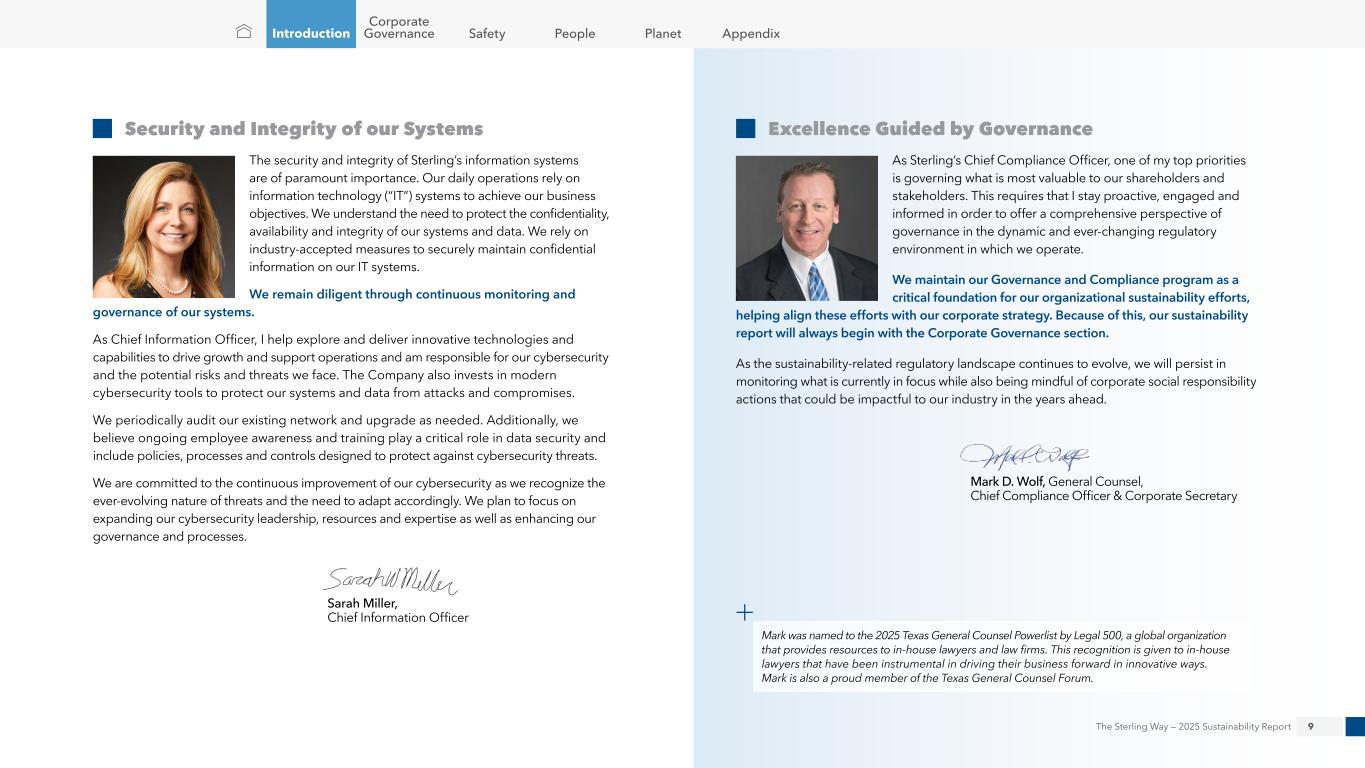 Security and Integrity of our Systems Excellence Guided by Governance The Sterling Way — 2025 Sustainability Report 9 The security and integrity of Sterling’s information systems are of paramount importance. Our daily operations rely on information technology (“IT”) systems to achieve our business objectives. We understand the need to protect the confidentiality, availability and integrity of our systems and data. We rely on industry-accepted measures to securely maintain confidential information on our IT systems. We remain diligent through continuous monitoring and governance of our systems. As Chief Information Officer, I help explore and deliver innovative technologies and capabilities to drive growth and support operations and am responsible for our cybersecurity and the potential risks and threats we face. The Company also invests in modern cybersecurity tools to protect our systems and data from attacks and compromises. We periodically audit our existing network and upgrade as needed. Additionally, we believe ongoing employee awareness and training play a critical role in data security and include policies, processes and controls designed to protect against cybersecurity threats. We are committed to the continuous improvement of our cybersecurity as we recognize the ever-evolving nature of threats and the need to adapt accordingly. We plan to focus on expanding our cybersecurity leadership, resources and expertise as well as enhancing our governance and processes. As Sterling’s Chief Compliance Officer, one of my top priorities is governing what is most valuable to our shareholders and stakeholders. This requires that I stay proactive, engaged and informed in order to offer a comprehensive perspective of governance in the dynamic and ever-changing regulatory environment in which we operate. We maintain our Governance and Compliance program as a critical foundation for our organizational sustainability efforts, helping align these efforts with our corporate strategy. Because of this, our sustainability report will always begin with the Corporate Governance section. As the sustainability-related regulatory landscape continues to evolve, we will persist in monitoring what is currently in focus while also being mindful of corporate social responsibility actions that could be impactful to our industry in the years ahead. Sarah Miller, Chief Information Officer Mark D. Wolf, General Counsel, Chief Compliance Officer & Corporate Secretary Mark was named to the 2025 Texas General Counsel Powerlist by Legal 500, a global organization that provides resources to in-house lawyers and law firms. This recognition is given to in-house lawyers that have been instrumental in driving their business forward in innovative ways. Mark is also a proud member of the Texas General Counsel Forum. Safety Corporate Governance People AppendixPlanetIntroduction