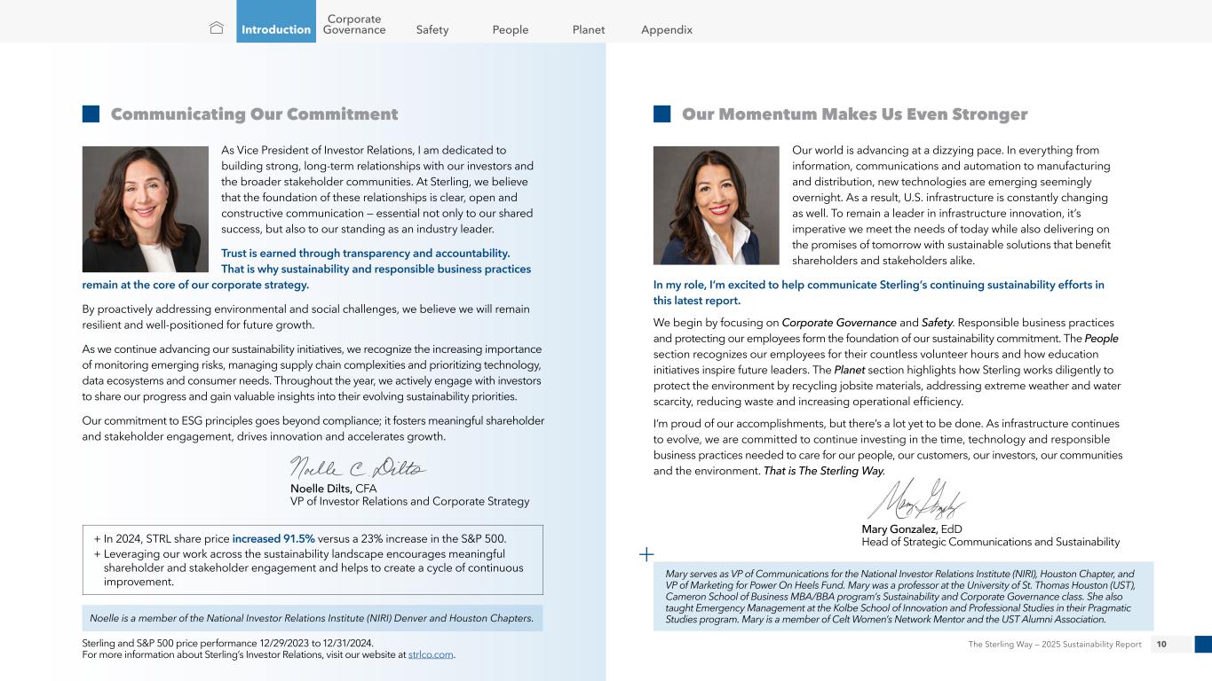Communicating Our Commitment Our Momentum Makes Us Even Stronger The Sterling Way — 2025 Sustainability Report 10 As Vice President of Investor Relations, I am dedicated to building strong, long-term relationships with our investors and the broader stakeholder communities. At Sterling, we believe that the foundation of these relationships is clear, open and constructive communication — essential not only to our shared success, but also to our standing as an industry leader. Trust is earned through transparency and accountability. That is why sustainability and responsible business practices remain at the core of our corporate strategy. By proactively addressing environmental and social challenges, we believe we will remain resilient and well-positioned for future growth. As we continue advancing our sustainability initiatives, we recognize the increasing importance of monitoring emerging risks, managing supply chain complexities and prioritizing technology, data ecosystems and consumer needs. Throughout the year, we actively engage with investors to share our progress and gain valuable insights into their evolving sustainability priorities. Our commitment to ESG principles goes beyond compliance; it fosters meaningful shareholder and stakeholder engagement, drives innovation and accelerates growth. Our world is advancing at a dizzying pace. In everything from information, communications and automation to manufacturing and distribution, new technologies are emerging seemingly overnight. As a result, U.S. infrastructure is constantly changing as well. To remain a leader in infrastructure innovation, it’s imperative we meet the needs of today while also delivering on the promises of tomorrow with sustainable solutions that benefit shareholders and stakeholders alike. In my role, I’m excited to help communicate Sterling’s continuing sustainability efforts in this latest report. We begin by focusing on Corporate Governance and Safety. Responsible business practices and protecting our employees form the foundation of our sustainability commitment. The People section recognizes our employees for their countless volunteer hours and how education initiatives inspire future leaders. The Planet section highlights how Sterling works diligently to protect the environment by recycling jobsite materials, addressing extreme weather and water scarcity, reducing waste and increasing operational efficiency. I’m proud of our accomplishments, but there’s a lot yet to be done. As infrastructure continues to evolve, we are committed to continue investing in the time, technology and responsible business practices needed to care for our people, our customers, our investors, our communities and the environment. That is The Sterling Way. Noelle Dilts, CFA VP of Investor Relations and Corporate Strategy Mary Gonzalez, EdD Head of Strategic Communications and Sustainability Mary serves as VP of Communications for the National Investor Relations Institute (NIRI), Houston Chapter, and VP of Marketing for Power On Heels Fund. Mary was a professor at the University of St. Thomas Houston (UST), Cameron School of Business MBA/BBA program’s Sustainability and Corporate Governance class. She also taught Emergency Management at the Kolbe School of Innovation and Professional Studies in their Pragmatic Studies program. Mary is a member of Celt Women’s Network Mentor and the UST Alumni Association.Noelle is a member of the National Investor Relations Institute (NIRI) Denver and Houston Chapters. Sterling and S&P 500 price performance 12/29/2023 to 12/31/2024. For more information about Sterling’s Investor Relations, visit our website at strlco.com. + In 2024, STRL share price increased 91.5% versus a 23% increase in the S&P 500. + Leveraging our work across the sustainability landscape encourages meaningful shareholder and stakeholder engagement and helps to create a cycle of continuous improvement. Safety Corporate Governance People AppendixPlanetIntroduction