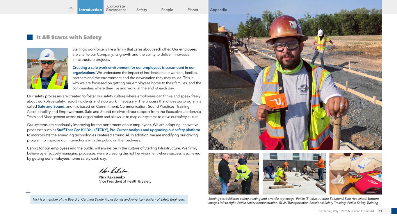 It All Starts with Safety The Sterling Way — 2025 Sustainability Report 11 Sterling’s workforce is like a family that cares about each other. Our employees are vital to our Company, its growth and the ability to deliver innovative infrastructure projects. Creating a safe work environment for our employees is paramount in our organizations. We understand the impact of incidents on our workers, families, partners and the environment and the devastation they may cause. This is why we are focussed on getting our employees home to their families, and the communities where they live and work, at the end of each day. Our safety processes are created to foster our safety culture where employees can thrive and speak freely about workplace safety, report incidents and stop work if necessary. The process that drives our program is called Safe and Sound, and it is based on Commitment, Communication, Sound Practices, Training, Accountability and Empowerment. Safe and Sound receives direct support from the Executive Leadership Team and Management across our organization and allows us to map our systems to drive our safety culture. Our systems are continually improving for the betterment of our employees. We are adopting innovative processes such as Stuff That Can Kill You (STCKY), Pre-Cursor Analysis and upgrading our safety platform to incorporate the emerging technologies centered around AI. In addition, we are modifying our driving program to improve our interactions with the public on the roadways. Caring for our employees and the public will always be in the culture of Sterling Infrastructure. We firmly believe by effectively managing processes, we are creating the right environment where success is achieved by getting our employees home safely each day. Nick Kakasenko Vice President of Health & Safety Nick is a member of the Board of Certified Safety Professionals and American Society of Safety Engineers. Sterling’s subsidiaries safety training and awards: top image, Petillo (E-Infrastructure Solutions) Safe Act award; bottom images left to right, Petillo safety demonstration; RLW (Transportation Solutions) Safety Training; Petillo Safety Training Introduction Corporate Governance Safety People Planet Appendix