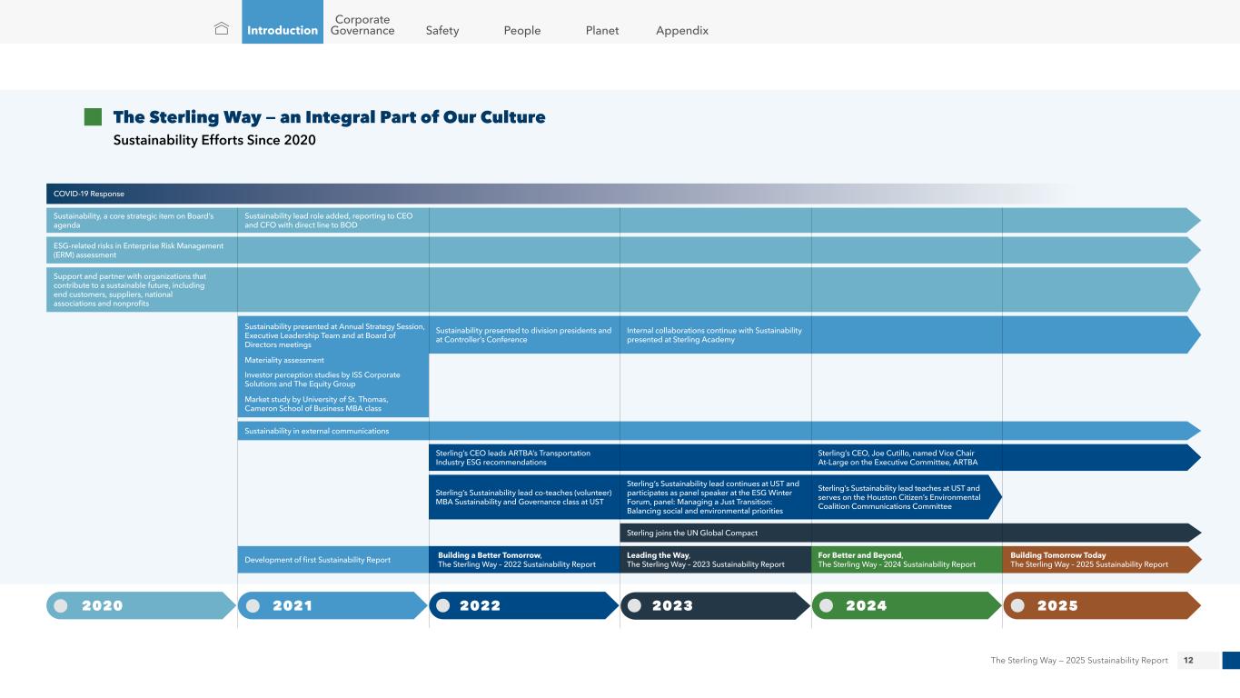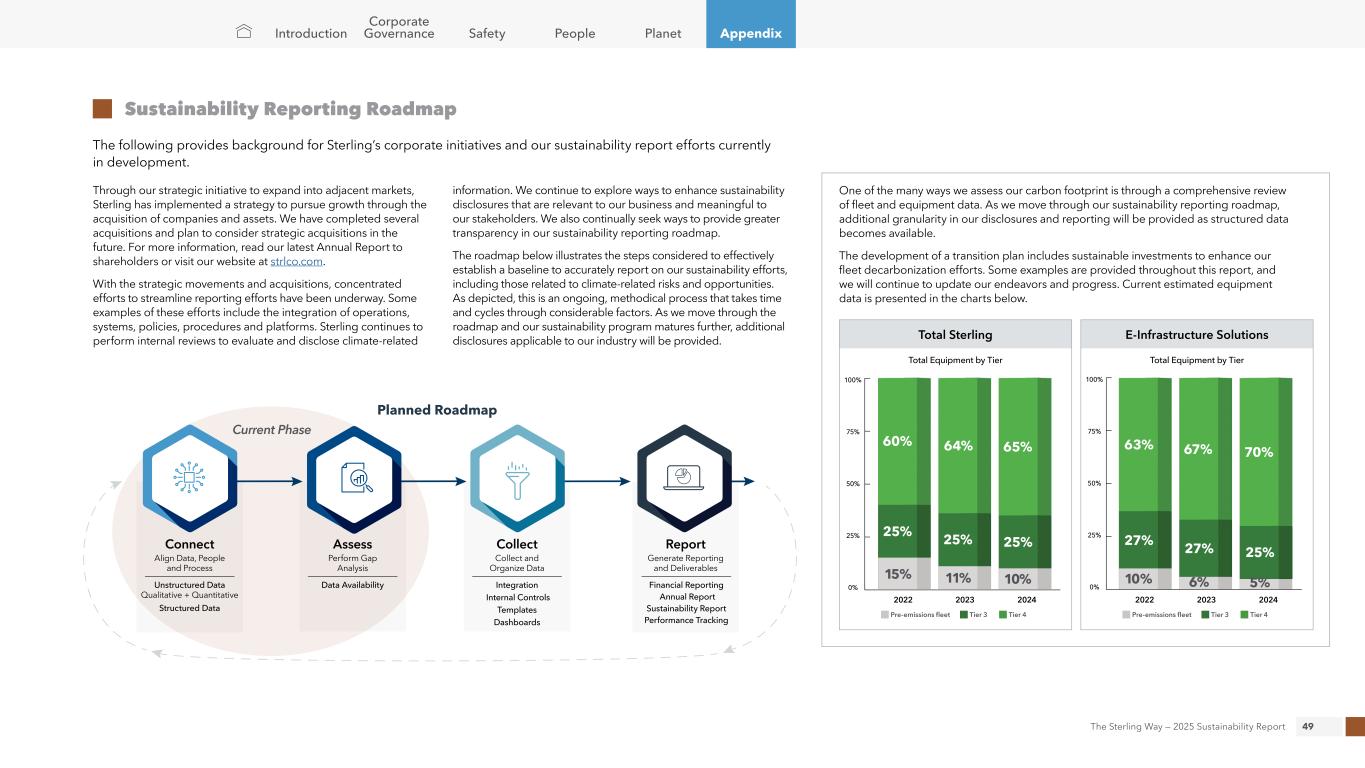 100% 75% 50% 25% 0% Total Sterling 100% 75% 50% 25% 0% Total Equipment by Tier Tier 4Tier 3Pre-emissions fleet E-Infrastructure Solutions 63% 67% 70% 27% 27% 25% 10% 6% 5% 2022 2023 2024 Total Equipment by Tier Tier 4Tier 3Pre-emissions fleet 60% 64% 65% 25% 25% 25% 15% 10%11% 2022 2023 2024 The Sterling Way — 2025 Sustainability Report 49 Sustainability Reporting Roadmap Through our strategic initiative to expand into adjacent markets, Sterling has implemented a strategy to pursue growth through the acquisition of companies and assets. We have completed several acquisitions and plan to consider strategic acquisitions in the future. For more information, read our latest Annual Report to shareholders or visit our website at strlco.com. With the strategic movements and acquisitions, concentrated efforts to streamline reporting efforts have been underway. Some examples of these efforts include the integration of operations, systems, policies, procedures and platforms. Sterling continues to perform internal reviews to evaluate and disclose climate-related information. We continue to explore ways to enhance sustainability disclosures that are relevant to our business and meaningful to our stakeholders. We also continually seek ways to provide greater transparency in our sustainability reporting roadmap. The roadmap below illustrates the steps considered to effectively establish a baseline to accurately report on our sustainability efforts, including those related to climate-related risks and opportunities. As depicted, this is an ongoing, methodical process that takes time and cycles through considerable factors. As we move through the roadmap and our sustainability program matures further, additional disclosures applicable to our industry will be provided. Connect Align Data, People and Process Assess Perform Gap Analysis Collect Collect and Organize Data Report Generate Reporting and Deliverables Unstructured Data Qualitative + Quantitative Structured Data Data Availability Integration Internal Controls Templates Dashboards Financial Reporting Annual Report Sustainability Report Performance Tracking Current Phase Planned Roadmap One of the many ways we assess our carbon footprint is through a comprehensive review of fleet and equipment data. As we move through our sustainability reporting roadmap, additional granularity in our disclosures and reporting will be provided as structured data becomes available. The development of a transition plan includes sustainable investments to enhance our fleet decarbonization efforts. Some examples are provided throughout this report, and we will continue to update our endeavors and progress. Current estimated equipment data is presented in the charts below. The following provides background for Sterling’s corporate initiatives and our sustainability report efforts currently in development. Introduction Safety Corporate Governance People AppendixPlanet