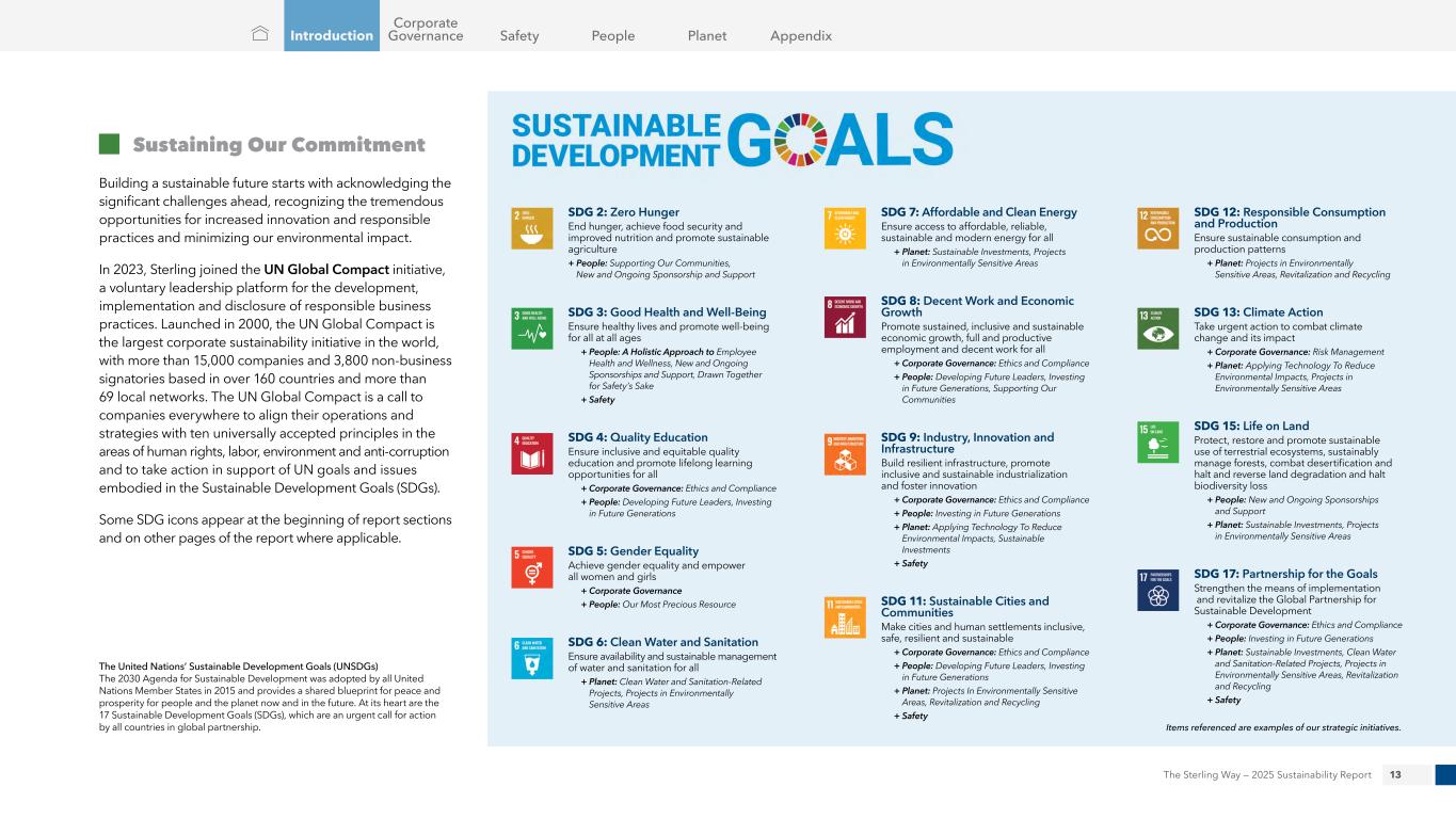 The Sterling Way — 2025 Sustainability Report 13 Sustaining Our Commitment Building a sustainable future starts with acknowledging the significant challenges ahead, recognizing the tremendous opportunities for increased innovation and responsible practices and minimizing our environmental impact. In 2023, Sterling joined the UN Global Compact initiative, a voluntary leadership platform for the development, implementation and disclosure of responsible business practices. Launched in 2000, the UN Global Compact is the largest corporate sustainability initiative in the world, with more than 15,000 companies and 3,800 non-business signatories based in over 160 countries and more than 69 local networks. The UN Global Compact is a call to companies everywhere to align their operations and strategies with ten universally accepted principles in the areas of human rights, labor, environment and anti-corruption and to take action in support of UN goals and issues embodied in the Sustainable Development Goals (SDGs). Some SDG icons appear at the beginning of report sections and on other pages of the report where applicable. The United Nations’ Sustainable Development Goals (UNSDGs) The 2030 Agenda for Sustainable Development was adopted by all United Nations Member States in 2015 and provides a shared blueprint for peace and prosperity for people and the planet now and in the future. At its heart are the 17 Sustainable Development Goals (SDGs), which are an urgent call for action by all countries in global partnership. SDG 2: Zero Hunger End hunger, achieve food security and improved nutrition and promote sustainable agriculture + People: Supporting Our Communities, New and Ongoing Sponsorship and Support SDG 3: Good Health and Well-Being Ensure healthy lives and promote well-being for all at all ages + People: A Holistic Approach to Employee Health and Wellness, New and Ongoing Sponsorships and Support, Drawn Together for Safety’s Sake + Safety SDG 4: Quality Education Ensure inclusive and equitable quality education and promote lifelong learning opportunities for all + Corporate Governance: Ethics and Compliance + People: Developing Future Leaders, Investing in Future Generations SDG 5: Gender Equality Achieve gender equality and empower all women and girls + Corporate Governance + People: Our Most Precious Resource SDG 6: Clean Water and Sanitation Ensure availability and sustainable management of water and sanitation for all + Planet: Clean Water and Sanitation-Related Projects, Projects in Environmentally Sensitive Areas SDG 12: Responsible Consumption and Production Ensure sustainable consumption and production patterns + Planet: Projects in Environmentally Sensitive Areas, Revitalization and Recycling SDG 13: Climate Action Take urgent action to combat climate change and its impact + Corporate Governance: Risk Management + Planet: Applying Technology To Reduce Environmental Impacts, Projects in Environmentally Sensitive Areas SDG 15: Life on Land Protect, restore and promote sustainable use of terrestrial ecosystems, sustainably manage forests, combat desertification and halt and reverse land degradation and halt biodiversity loss + People: New and Ongoing Sponsorships and Support + Planet: Sustainable Investments, Projects in Environmentally Sensitive Areas SDG 17: Partnership for the Goals Strengthen the means of implementation and revitalize the Global Partnership for Sustainable Development + Corporate Governance: Ethics and Compliance + People: Investing in Future Generations + Planet: Sustainable Investments, Clean Water and Sanitation-Related Projects, Projects in Environmentally Sensitive Areas, Revitalization and Recycling + Safety SDG 7: Affordable and Clean Energy Ensure access to affordable, reliable, sustainable and modern energy for all + Planet: Sustainable Investments, Projects in Environmentally Sensitive Areas SDG 8: Decent Work and Economic Growth Promote sustained, inclusive and sustainable economic growth, full and productive employment and decent work for all + Corporate Governance: Ethics and Compliance + People: Developing Future Leaders, Investing in Future Generations, Supporting Our Communities SDG 9: Industry, Innovation and Infrastructure Build resilient infrastructure, promote inclusive and sustainable industrialization and foster innovation + Corporate Governance: Ethics and Compliance + People: Investing in Future Generations + Planet: Applying Technology To Reduce Environmental Impacts, Sustainable Investments + Safety SDG 11: Sustainable Cities and Communities Make cities and human settlements inclusive, safe, resilient and sustainable + Corporate Governance: Ethics and Compliance + People: Developing Future Leaders, Investing in Future Generations + Planet: Projects In Environmentally Sensitive Areas, Revitalization and Recycling + Safety Items referenced are examples of our strategic initiatives. Safety Corporate Governance People AppendixPlanetIntroduction