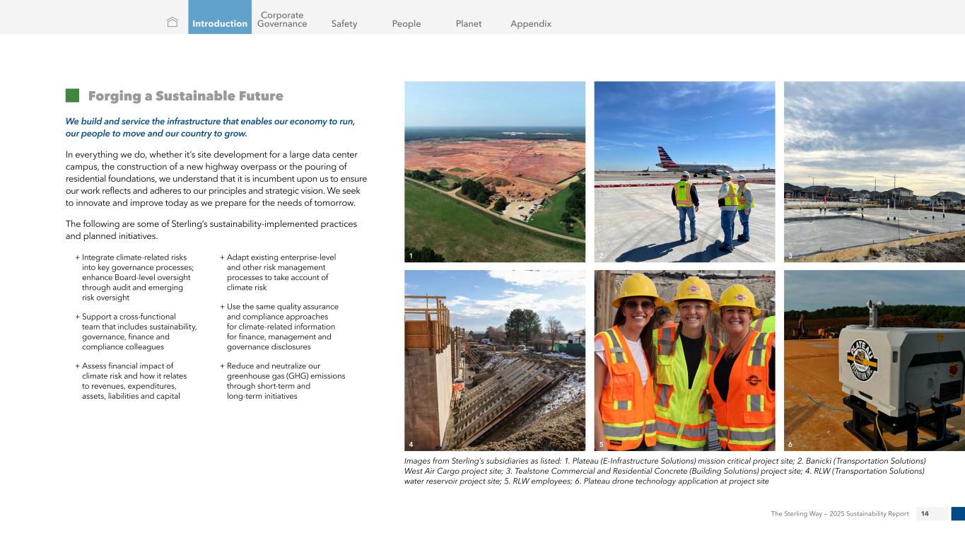 The Sterling Way — 2025 Sustainability Report 14 Forging a Sustainable Future We build and service the infrastructure that enables our economy to run, our people to move and our country to grow. In everything we do, whether it’s site development for a large data center campus, the construction of a new highway overpass or the pouring of residential foundations, we understand that it is incumbent upon us to ensure our work reflects and adheres to our principles and strategic vision. We seek to innovate and improve today as we prepare for the needs of tomorrow. The following are some of Sterling’s sustainability-implemented practices and planned initiatives. + Integrate climate-related risks into key governance processes; enhance Board-level oversight through audit and emerging risk oversight + Support a cross-functional team that includes sustainability, governance, finance and compliance colleagues + Assess financial impact of climate risk and how it relates to revenues, expenditures, assets, liabilities and capital + Adapt existing enterprise-level and other risk management processes to take account of climate risk + Use the same quality assurance and compliance approaches for climate-related information for finance, management and governance disclosures + Reduce and neutralize our greenhouse gas (GHG) emissions through short-term and long-term initiatives Images from Sterling’s subsidiaries as listed: 1. Plateau (E-Infrastructure Solutions) mission critical project site; 2. Banicki (Transportation Solutions) West Air Cargo project site; 3. Tealstone Commercial and Residential Concrete (Building Solutions) project site; 4. RLW (Transportation Solutions) water reservoir project site; 5. RLW employees; 6. Plateau drone technology application at project site 4 1 6 3 5 2 Safety Corporate Governance People AppendixPlanetIntroduction
