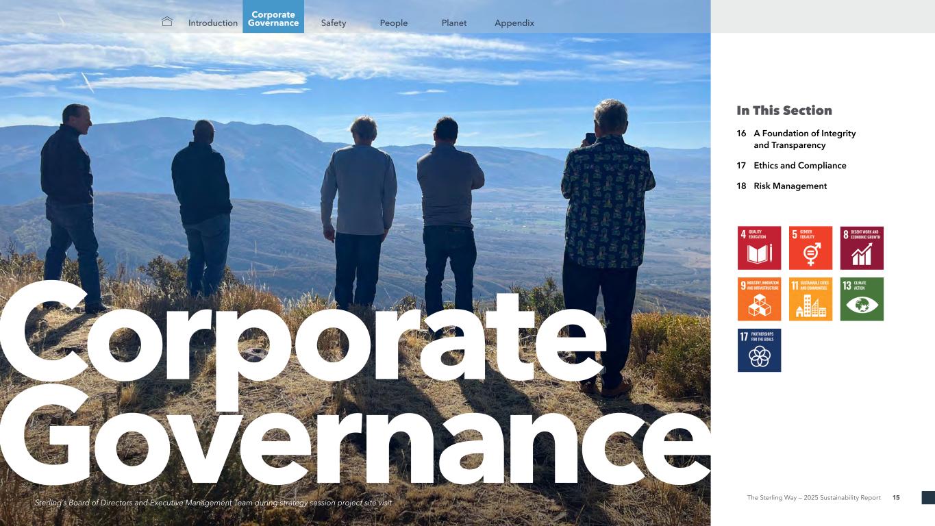 The Sterling Way — 2025 Sustainability Report 15 Governance Corporate In This Section 16 A Foundation of Integrity and Transparency 17 Ethics and Compliance 18 Risk Management Sterling’s Board of Directors and Executive Management Team during strategy session project site visit Introduction Corporate Governance Safety People Planet Appendix