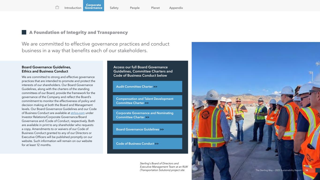 The Sterling Way — 2025 Sustainability Report 16 Board Governance Guidelines, Ethics and Business Conduct We are committed to strong and effective governance practices that are intended to promote and protect the interests of our shareholders. Our Board Governance Guidelines, along with the charters of the standing committees of our Board, provide the framework for the governance of the Company and reflect the Board’s commitment to monitor the effectiveness of policy and decision making at both the Board and Management levels. Our Board Governance Guidelines and our Code of Business Conduct are available at strlco.com under Investor Relations/Corporate Governance/Board Governance and /Code of Conduct, respectively. Both are available in print to any shareholder who requests a copy. Amendments to or waivers of our Code of Business Conduct granted to any of our Directors or Executive Officers will be published promptly on our website. Such information will remain on our website for at least 12 months. A Foundation of Integrity and Transparency We are committed to effective governance practices and conduct business in a way that benefits each of our stakeholders. Audit Committee Charter >> Compensation and Talent Development Committee Charter >> Corporate Governance and Nominating Committee Charter >> Board Governance Guidelines >> Code of Business Conduct >> Access our full Board Governance Guidelines, Committee Charters and Code of Business Conduct below Sterling’s Board of Directors and Executive Management Team at an RLW (Transportation Solutions) project site Introduction Safety Corporate Governance People AppendixPlanet