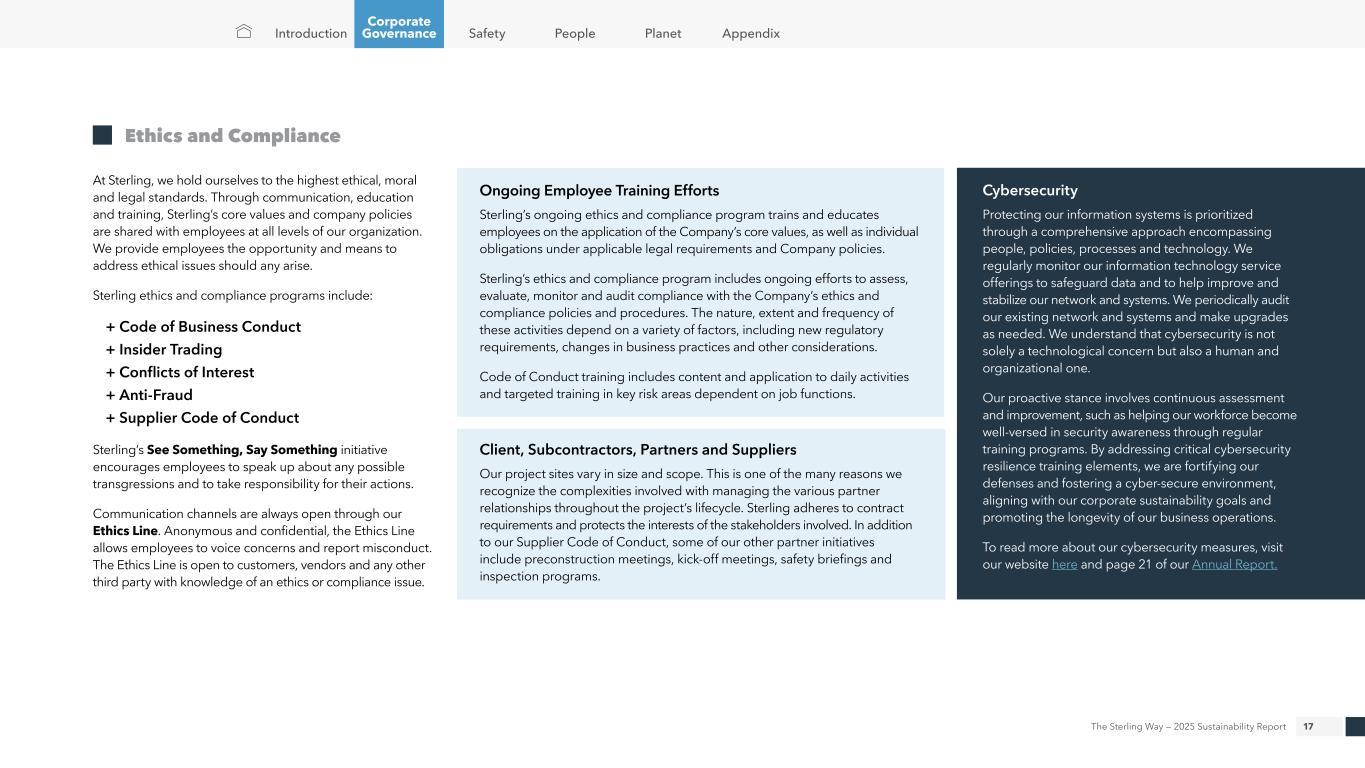 The Sterling Way — 2025 Sustainability Report 17 Ethics and Compliance At Sterling, we hold ourselves to the highest ethical, moral and legal standards. Through communication, education and training, Sterling’s core values and company policies are shared with employees at all levels of our organization. We provide employees the opportunity and means to address ethical issues should any arise. Sterling ethics and compliance programs include: + Code of Business Conduct + Insider Trading + Conflicts of Interest + Anti-Fraud + Supplier Code of Conduct Sterling’s See Something, Say Something initiative encourages employees to speak up about any possible transgressions and to take responsibility for their actions. Communication channels are always open through our Ethics Line. Anonymous and confidential, the Ethics Line allows employees to voice concerns and report misconduct. The Ethics Line is open to customers, vendors and any other third party with knowledge of an ethics or compliance issue. Ongoing Employee Training Efforts Sterling’s ongoing ethics and compliance program trains and educates employees on the application of the Company’s core values, as well as individual obligations under applicable legal requirements and Company policies. Sterling’s ethics and compliance program includes ongoing efforts to assess, evaluate, monitor and audit compliance with the Company’s ethics and compliance policies and procedures. The nature, extent and frequency of these activities depend on a variety of factors, including new regulatory requirements, changes in business practices and other considerations. Code of Conduct training includes content and application to daily activities and targeted training in key risk areas dependent on job functions. Client, Subcontractors, Partners and Suppliers Our project sites vary in size and scope. This is one of the many reasons we recognize the complexities involved with managing the various partner relationships throughout the project’s lifecycle. Sterling adheres to contract requirements and protects the interests of the stakeholders involved. In addition to our Supplier Code of Conduct, some of our other partner initiatives include preconstruction meetings, kick-off meetings, safety briefings and inspection programs. Cybersecurity Protecting our information systems is prioritized through a comprehensive approach encompassing people, policies, processes and technology. We regularly monitor our information technology service offerings to safeguard data and to help improve and stabilize our network and systems. We periodically audit our existing network and systems and make upgrades as needed. We understand that cybersecurity is not solely a technological concern but also a human and organizational one. Our proactive stance involves continuous assessment and improvement, such as helping our workforce become well-versed in security awareness through regular training programs. By addressing critical cybersecurity resilience training elements, we are fortifying our defenses and fostering a cyber-secure environment, aligning with our corporate sustainability goals and promoting the longevity of our business operations. To read more about our cybersecurity measures, visit our website here and page 21 of our Annual Report. Introduction Safety Corporate Governance People AppendixPlanet